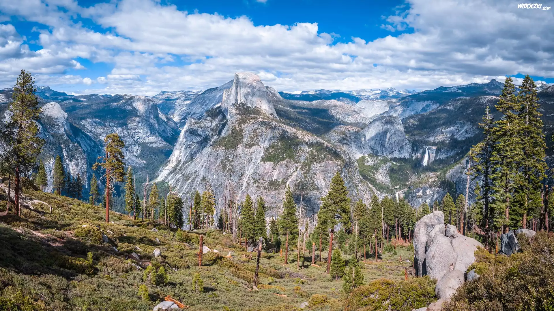 Widok, Punkt widokowy Glacier Point, Dolina, Yosemite Valley, Góry, Sierra Nevada, Szczyt Half Dome, Drzewa, Sosny, Park Narodowy Yosemite, Kalifornia, Stany Zjednoczone |