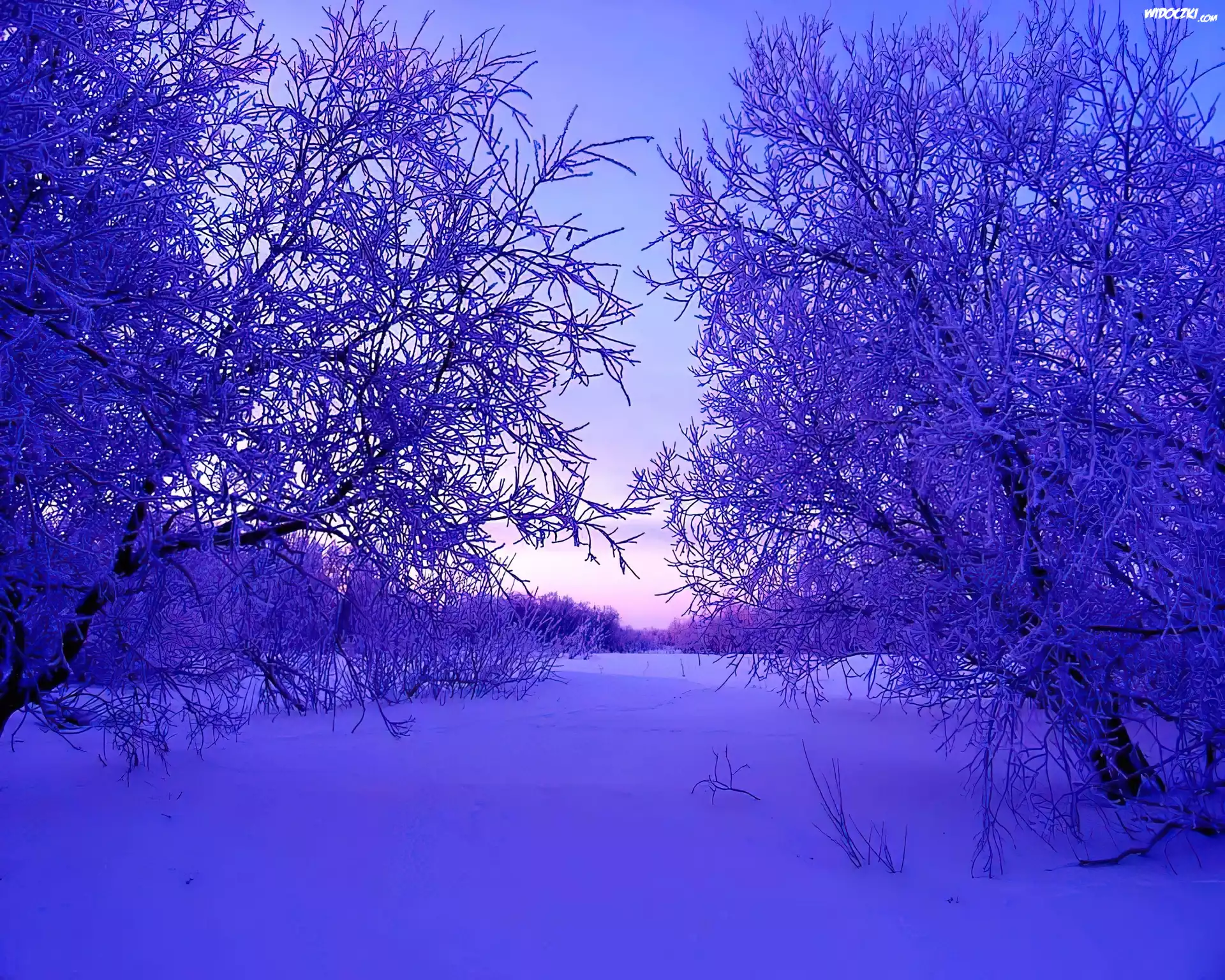 Wieczór, Śnieg, Zima, Drzewa, Las