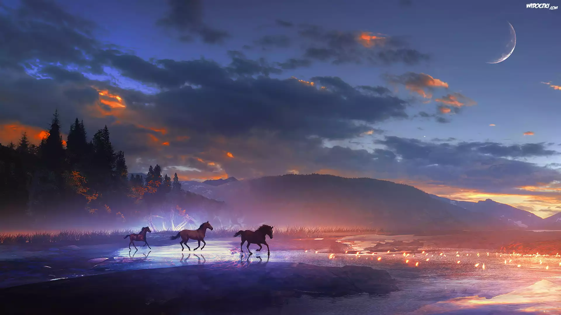 Zdjęcia, Grafika, Wieczór, Konie, Góry, Księżyc, Chmury, Rzeka