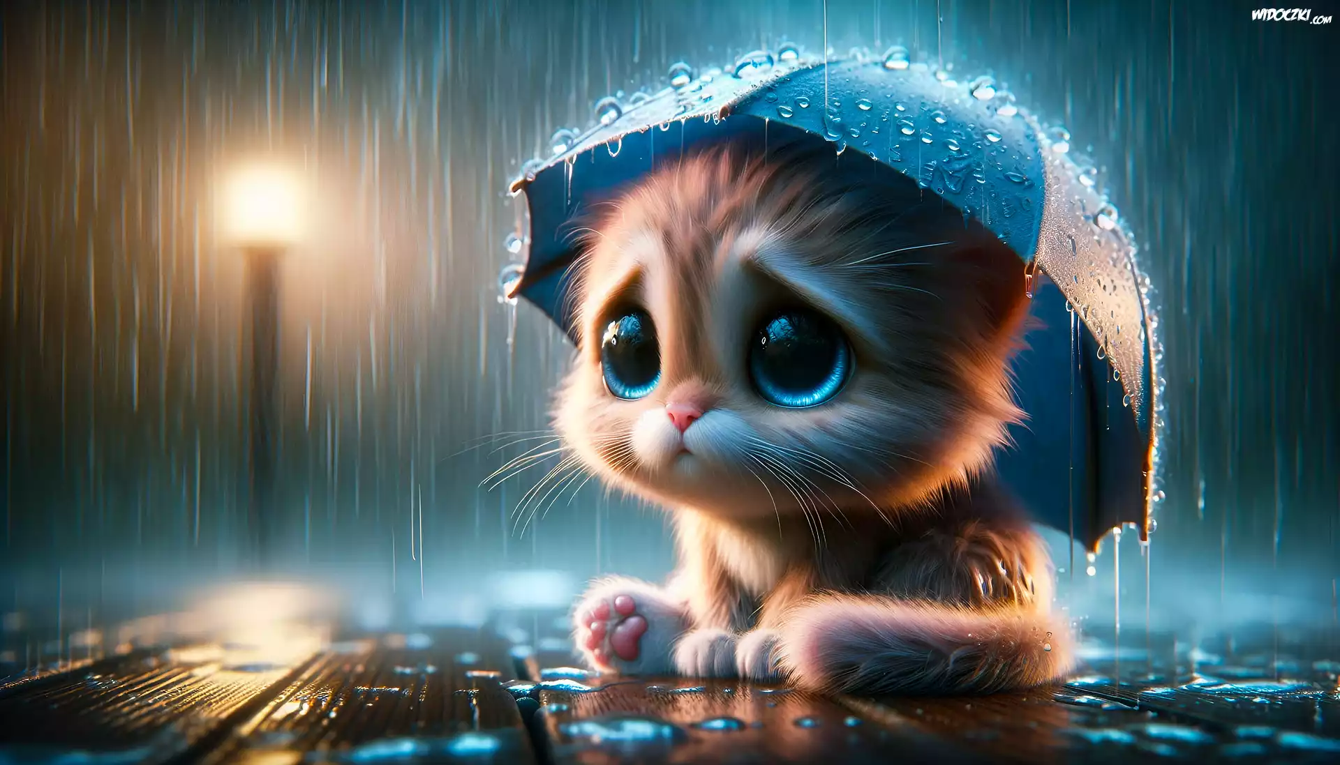 Zdjęcia, Kot, Deszcz, Parasol, Wieczór