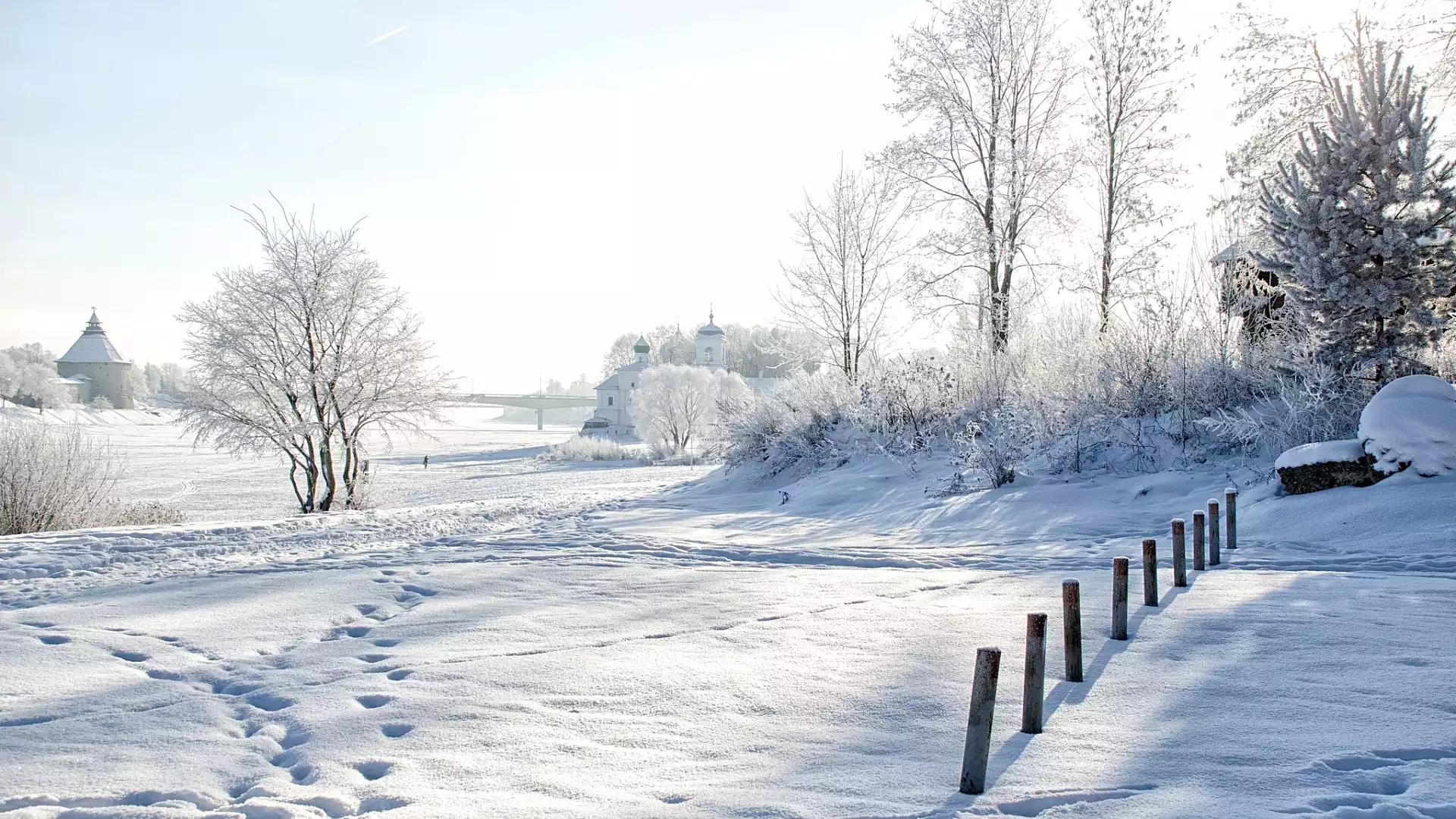 Rosja, Psków, Zaśnieżona, Rzeka Wielikaja, Zima, Miroski Monaster Przemienienia Pańskiego, Klasztor, Most, Drzewa, Słupki |