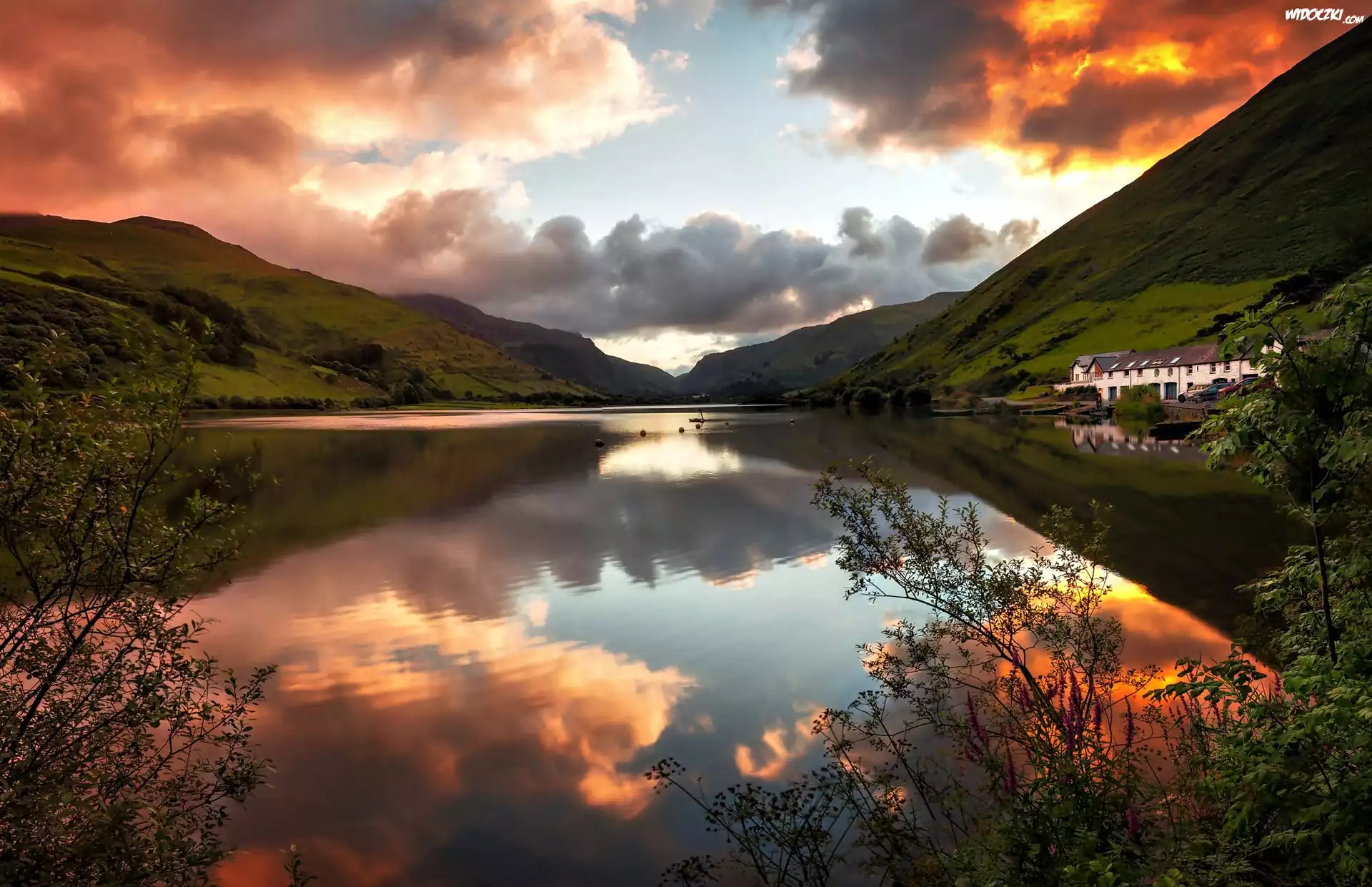 Zdjęcia, Wielka Brytania, Walia, Park Narodowy Snowdonia, Jezioro Tal-y-llyn Lake, Góry, Domy