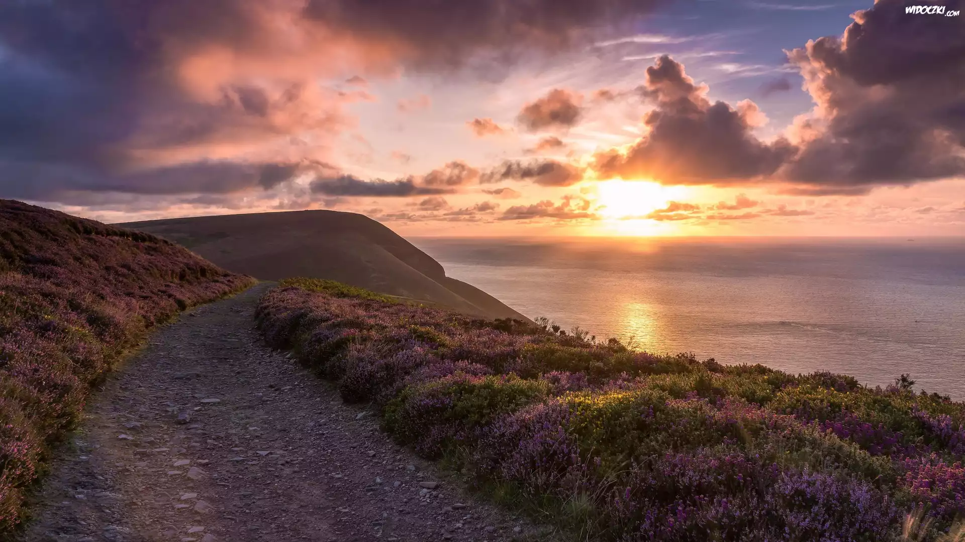 Wielka Brytania, Anglia, Hrabstwo Devon, Park Narodowy Exmoor, Wzgórze Hangman, Zachód słońca, Wybrzeże, Droga, Wrzos, Morze |