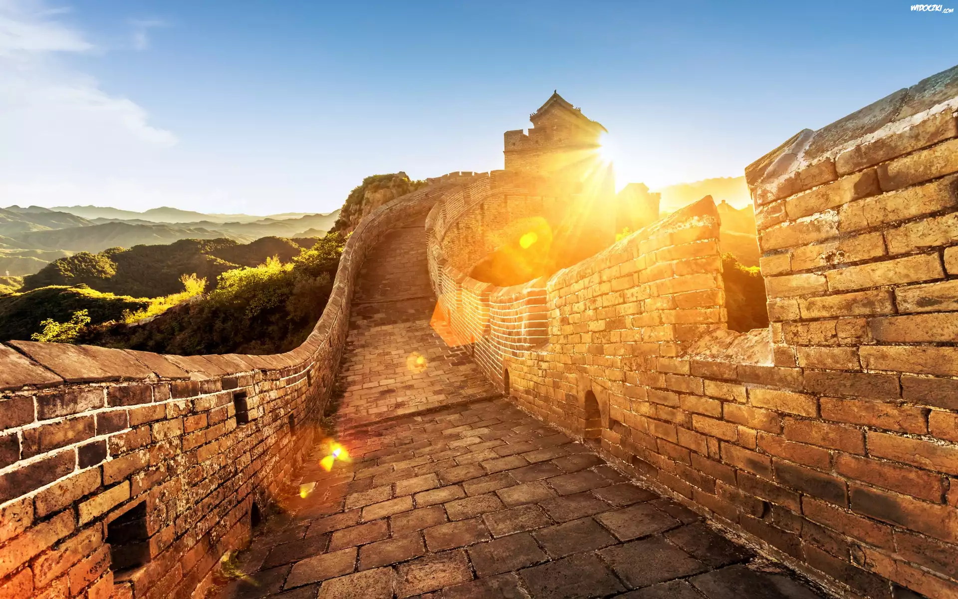 Chiny, Wielki Mur Chiński, Wschód słońca, Promienie, Góry