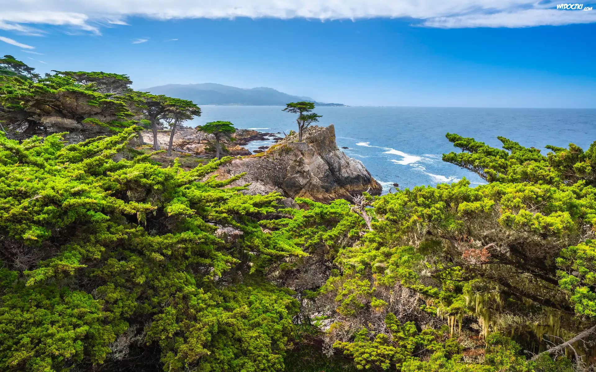 Skały, Drzewa, Cyprys wielkoszyszkowy, Pebble Beach, Morze, Zatoka, Carmel Bay, Kalifornia, Stany Zjednoczone |