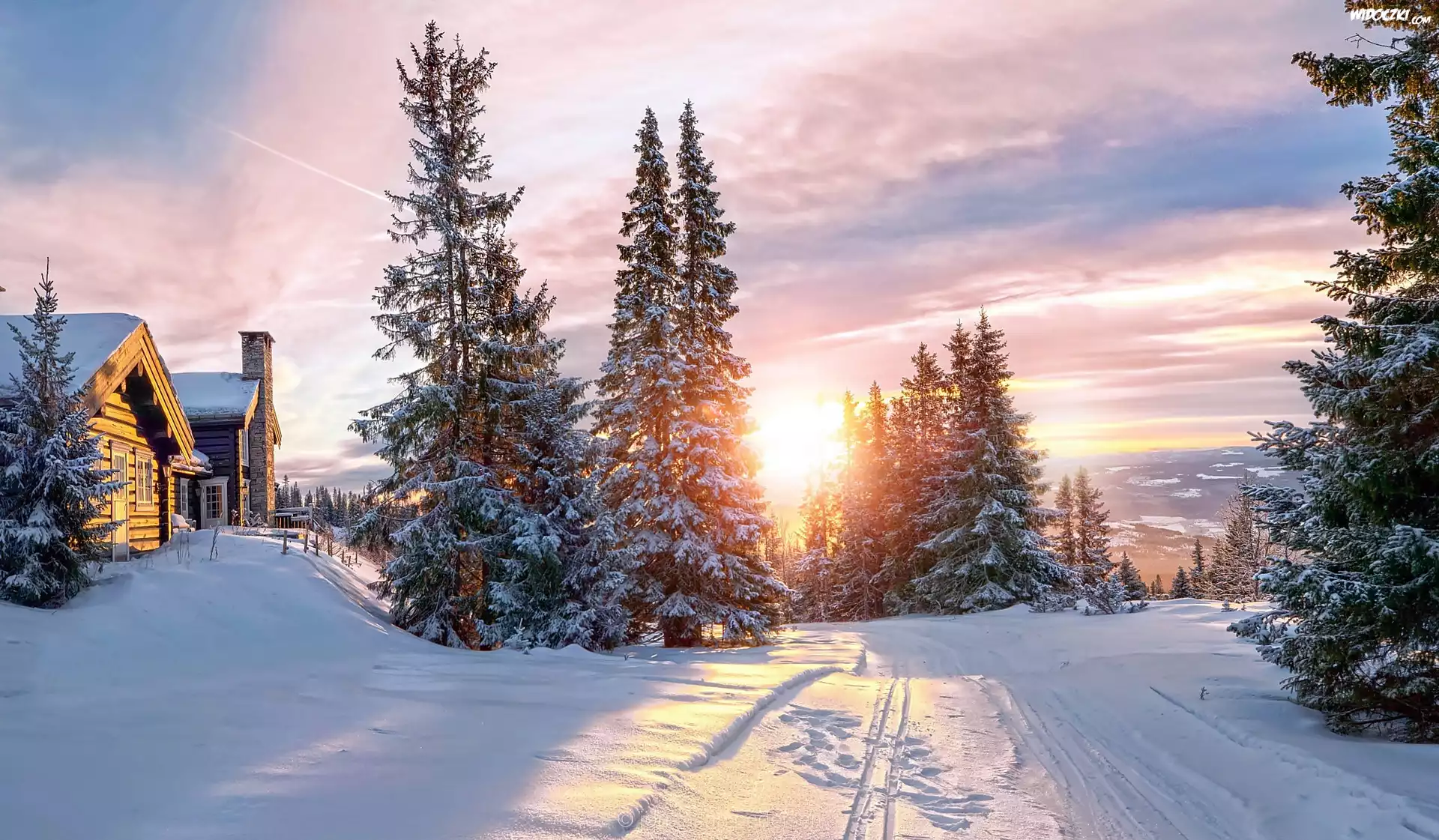 Góry, Świerki, Wschód słońca, Zima, Domy, Droga