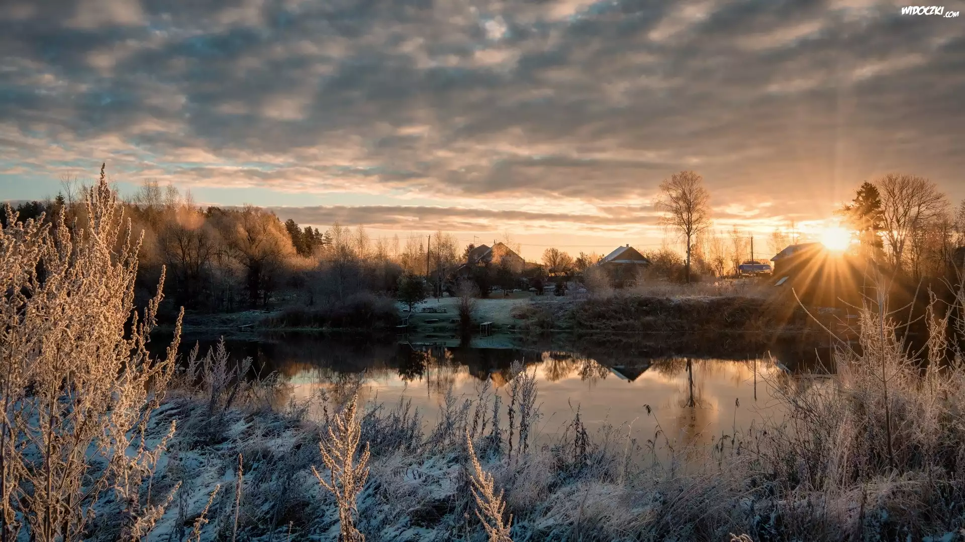Zdjęcia, Łotwa, Łatgalia, Rzeka Dubna, Wieś, Świt, Wschód słońca, Domy, Drzewa, Szron