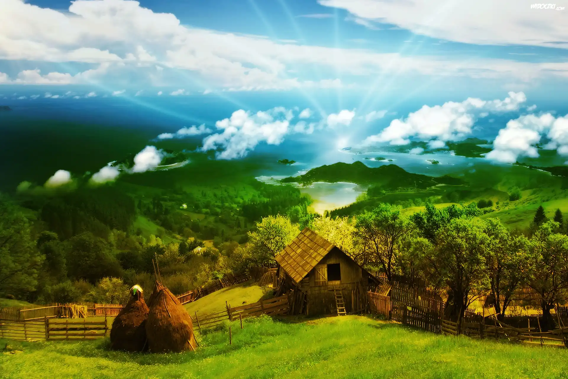 Zdjęcia, Wieś, Chmury, Góry, Jezioro