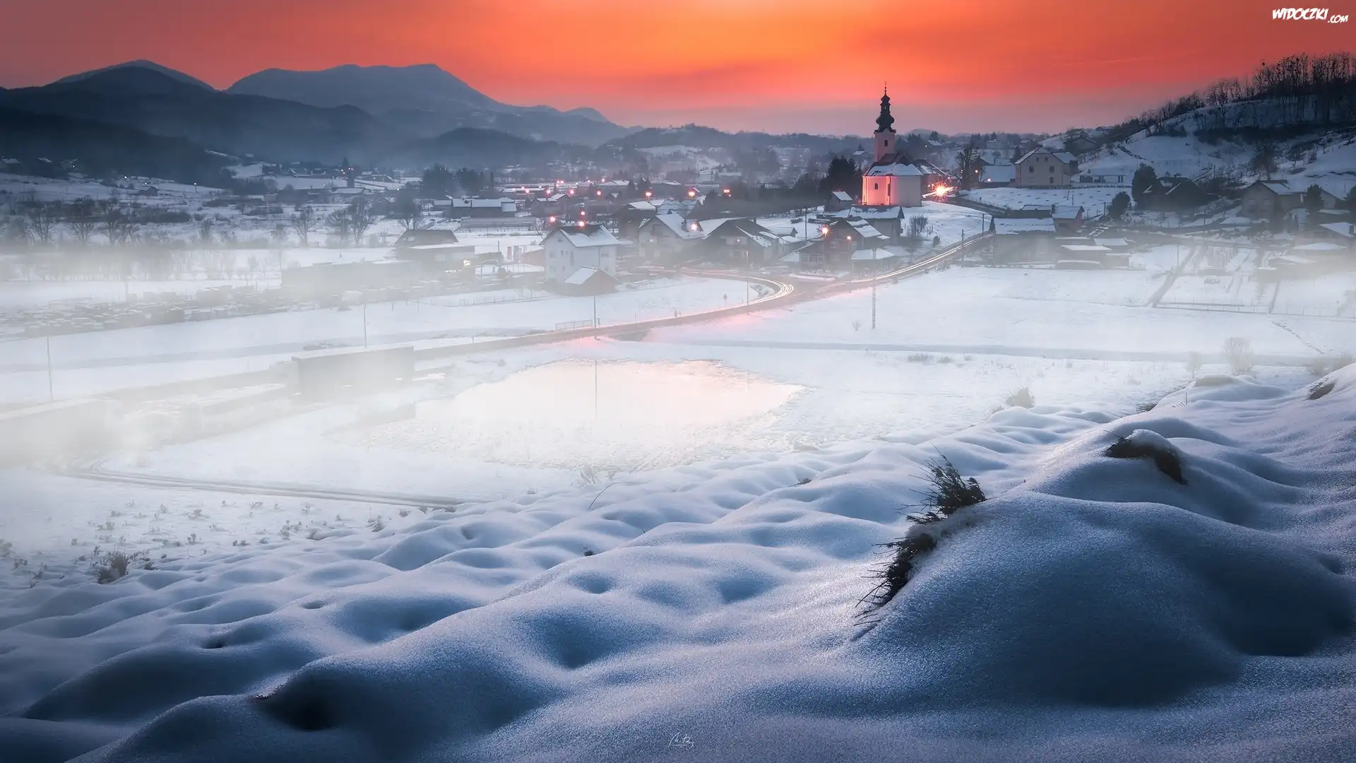 Zdjęcia, Zima, Wieś Bednja, Chorwacja, Kościół, Zachód słońca, Mgła