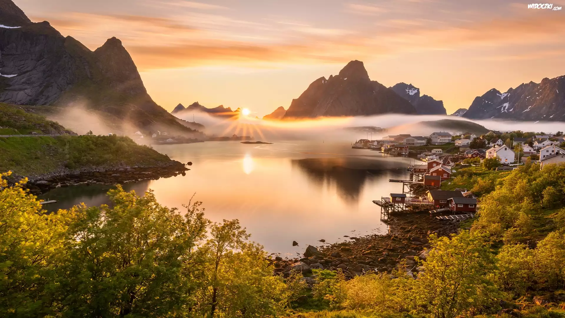 Zdjęcia, Norwegia, Lofoty, Wieś Reine, Morze Norweskie, Domy, Góry, Mgła, Wschód słońca