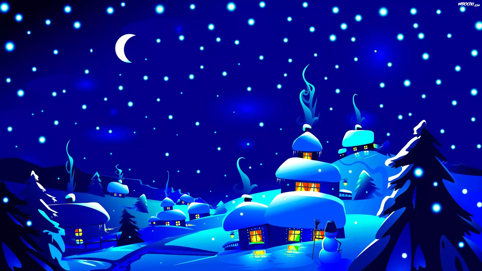 Wieś, Domy, Śnieg, Drzewa, Noc, Księżyc