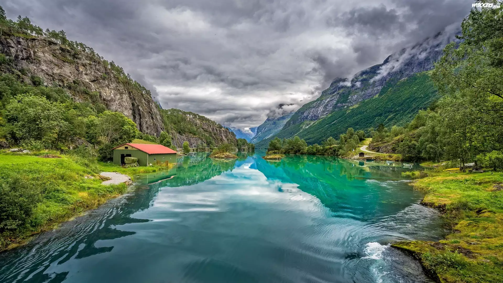 Zdjęcia, Norwegia, Wieś Loen, Rzeka, Góry, Drzewa, Dom