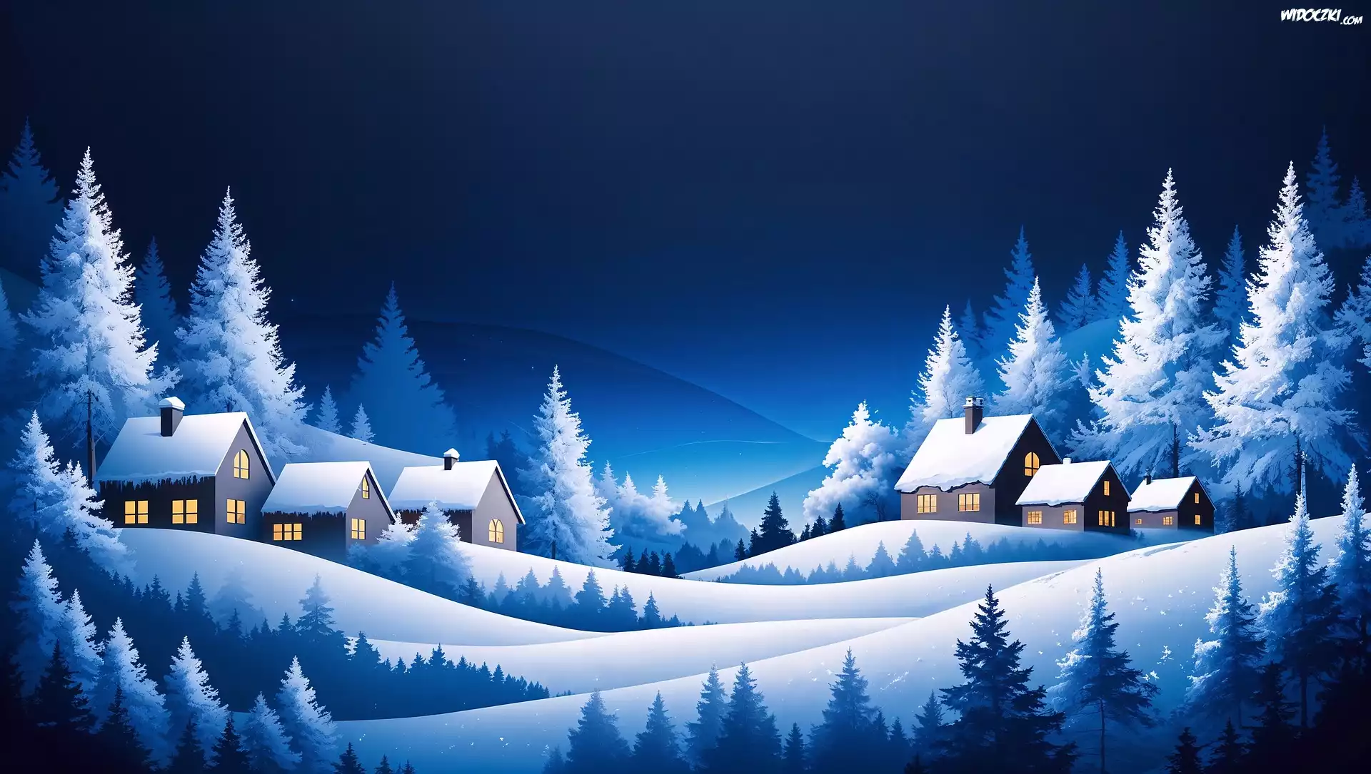 Zima, Drzewa, Åšnieg, WieÅ›, Domy, Noc, Grafika
