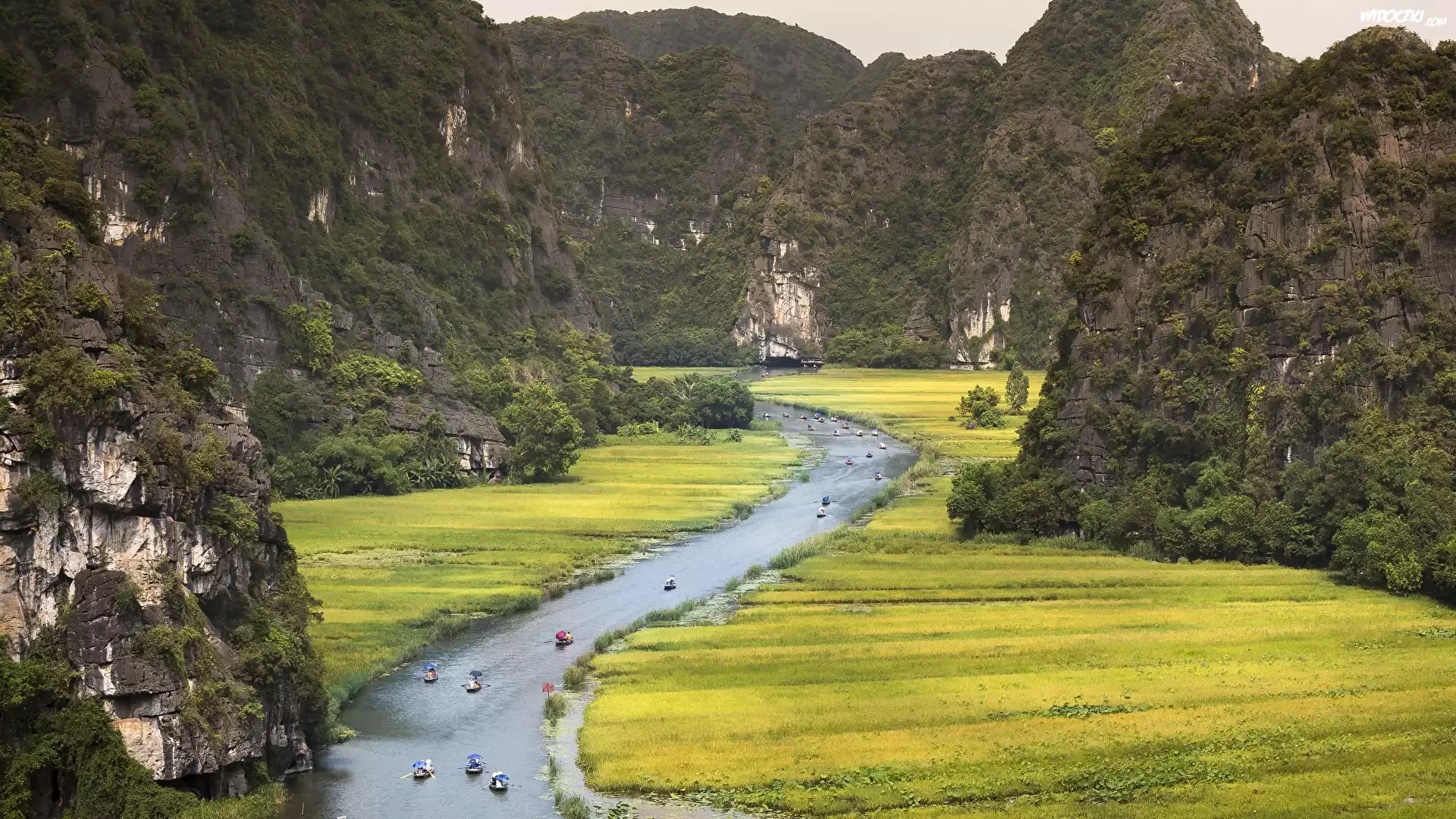 Zdjęcia, Wietnam, Prowincja Ninh Binh, Rzeka Ngo Dong, Łódki, Góry, Atrakcja turystyczna, Tam Coc Ninh Binh