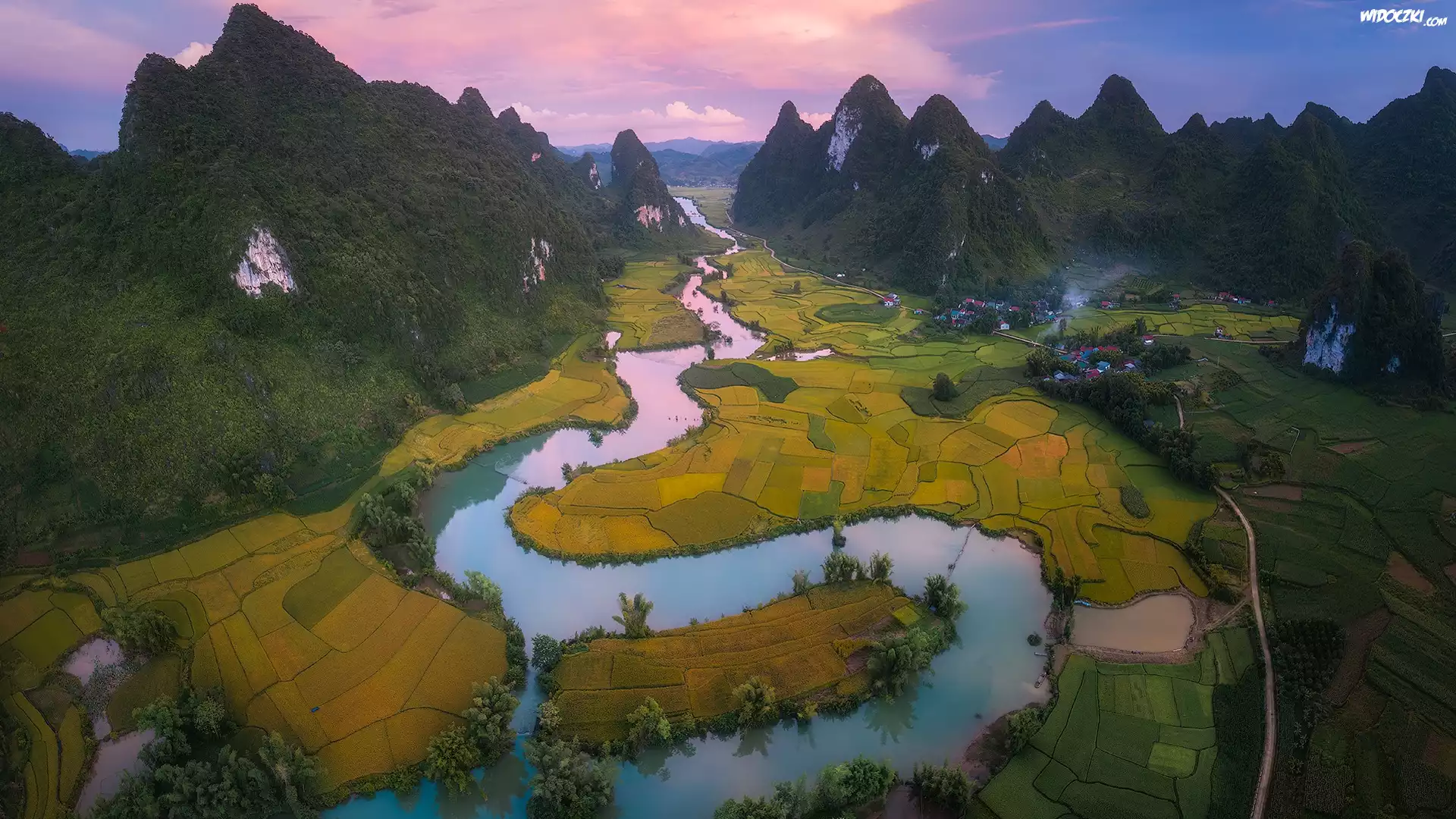 Zdjęcia, Kręta, Rzeka, Pola, Góry, Prowincja Cao Bang, Wietnam