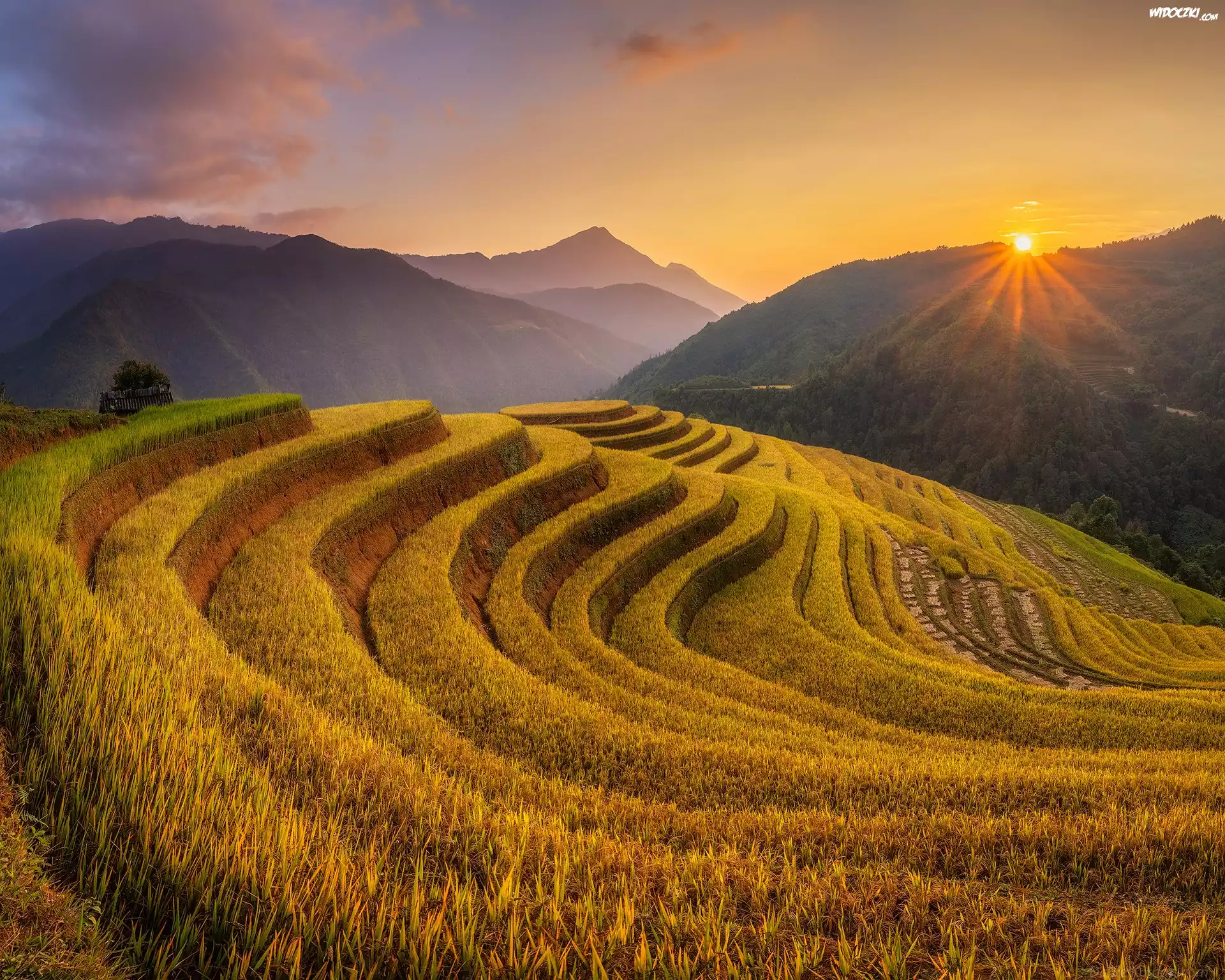 Zdjęcia, Pola, Tarasy ryżowe, Góry, Lasy, Promienie słońca, Wietnam