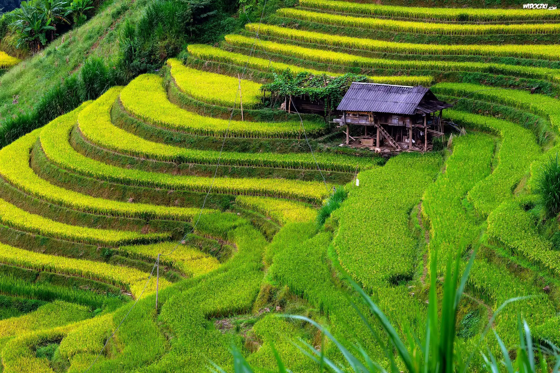 Pola, Tarasy ryżowe, Uprawa, Wzgórza, Szopa, Dom, Wietnam