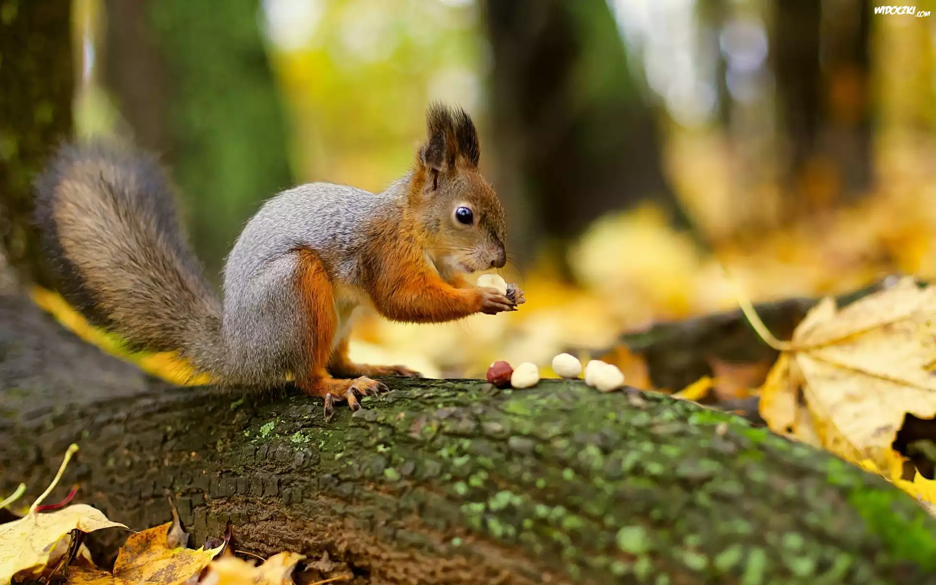 Zdjęcia, Wiewiórka, Las, Liście, Orzechy, Jesień
