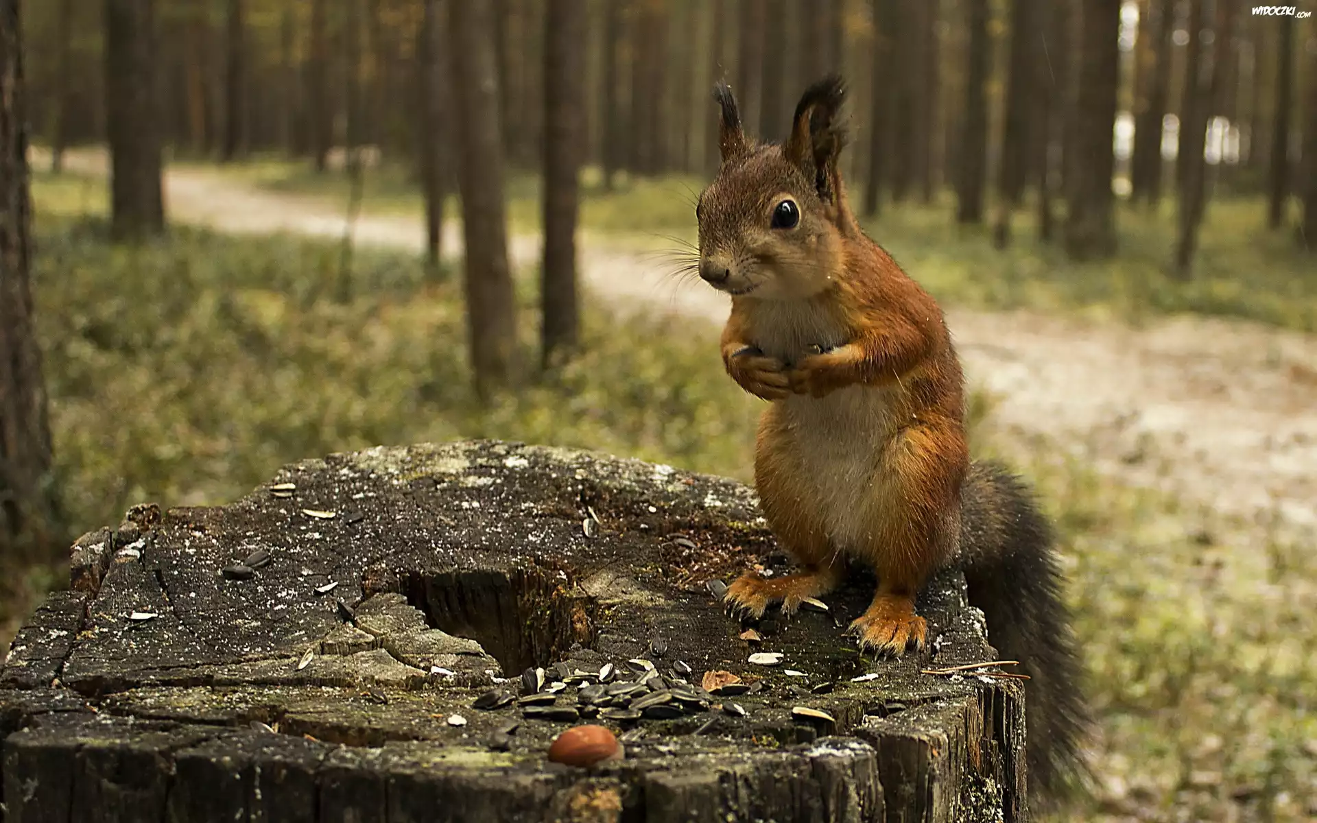 Zdjęcia, Wiewiórka, Pień, Drzewa, Pestki, Słonecznika, Las