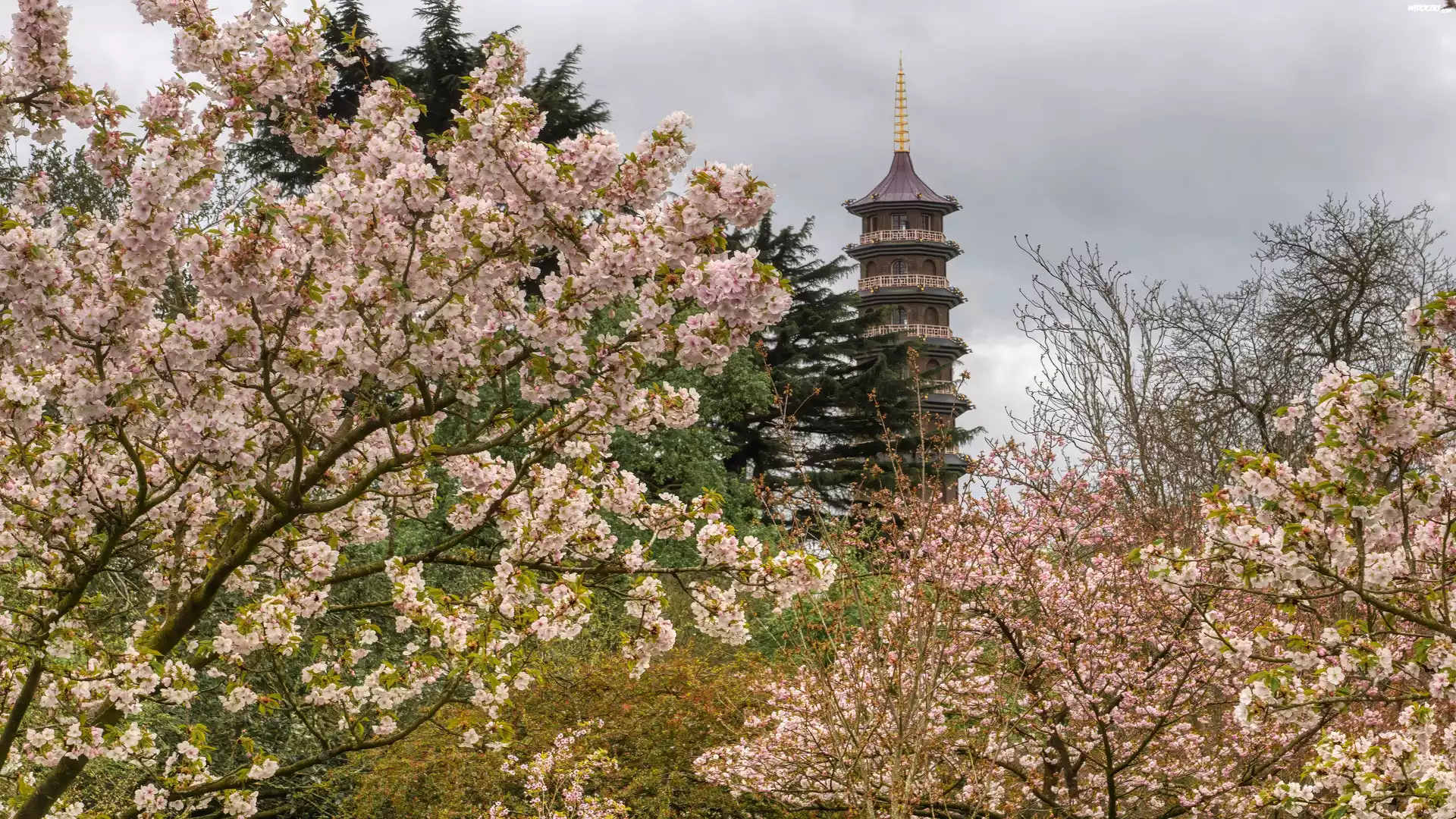 Zdjęcia, Pagoda, Wieża, Drzewa, Kwiaty, Wiosna