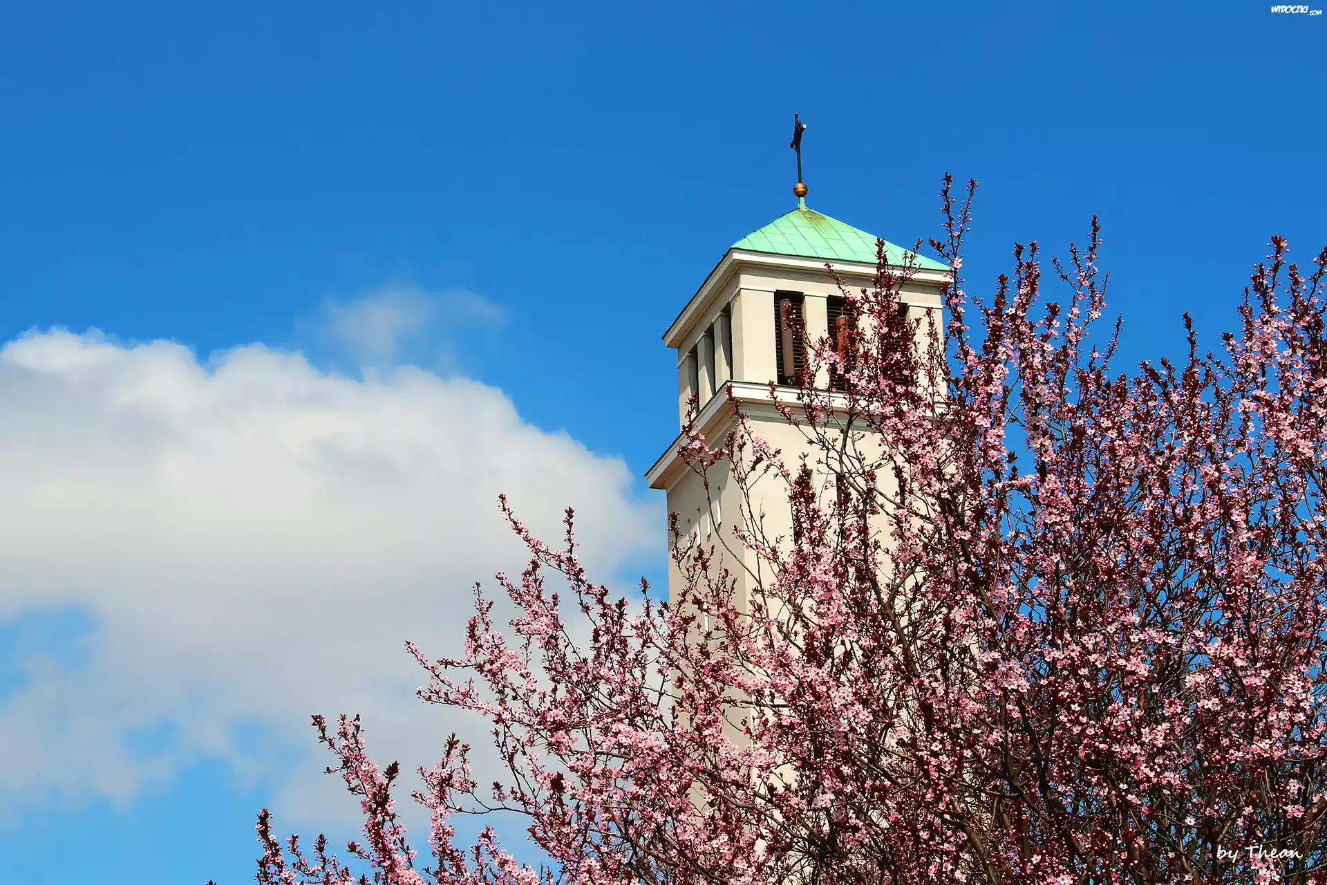 Zdjęcia, Wieża, Kościoła, Kwitnące, Drzewo