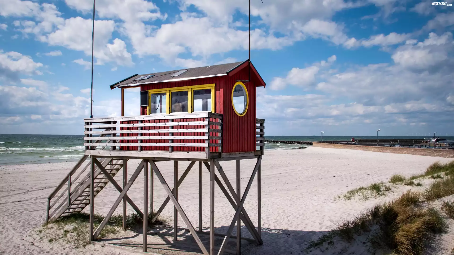 Zdjęcia, Wieża ratownicza, Plaża, Piasek, Morze, Chmury