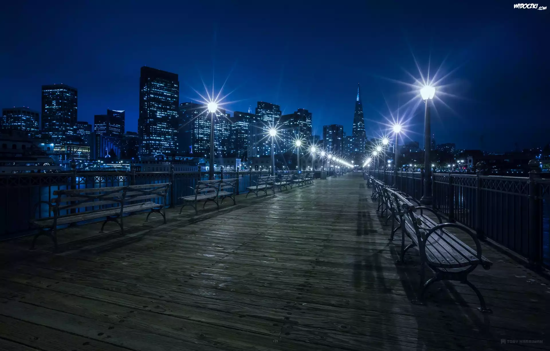 Zdjęcia, Wieżowce, Latarnie, Molo, Ławki, Miasto nocą