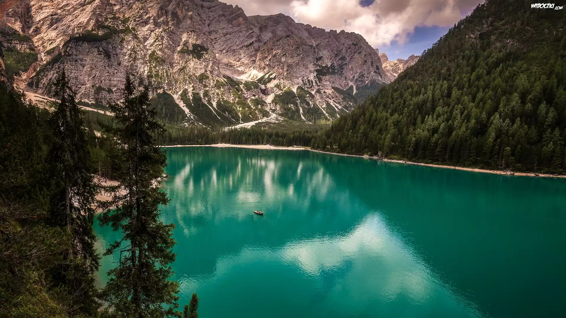 Góry, Dolomity, Jezioro Pragser Wildsee, Lago di Braies, Drzewa, Świerki, Łódka, Południowy Tyrol, Włochy |