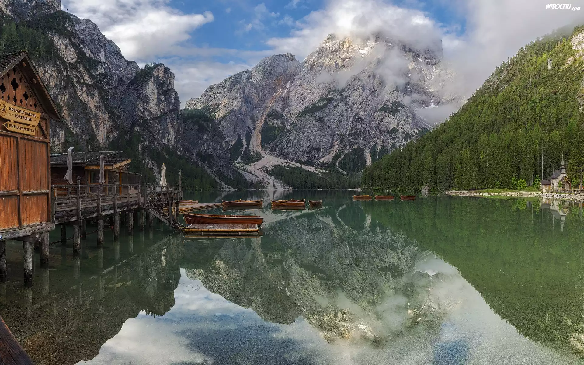 Zdjęcia, Włochy, Jezioro, Pragser Wildsee, Lago di Braies, Góry, Dolomity, Łódki, Drzewa, Chmury, Odbicie