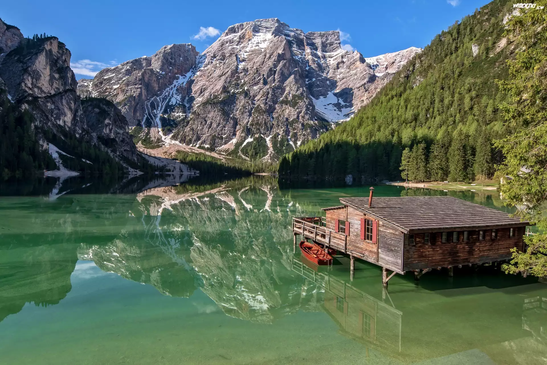 Zdjęcia, Włochy, Południowy Tyrol, Jezioro Pragser Wildsee, Góry, Dolomity, Drewniany, Dom, Łódki, Drzewa
