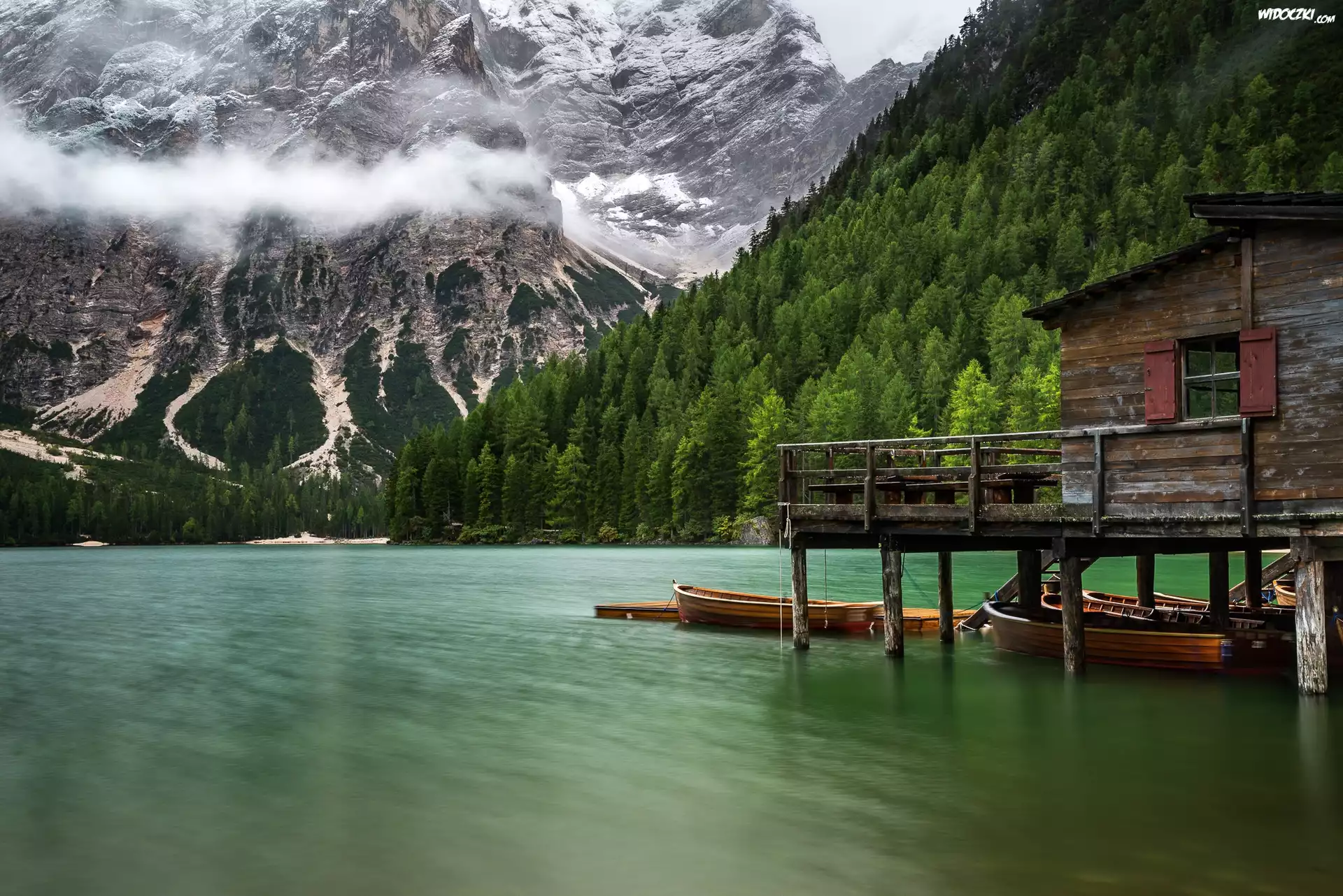 Zdjęcia, Włochy, Południowy Tyrol, Jezioro Pragser Wildsee, Góry Dolomity, Drzewa, Drewniany, Dom, Łódki