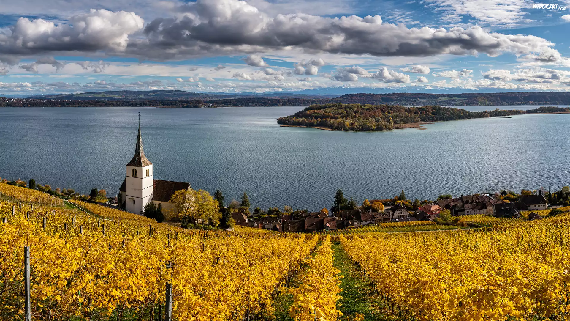 Zdjęcia, Szwajcaria, Kanton Berno, Gmina Ligerz, Jezioro, Bielersee, Kościół, Winnica