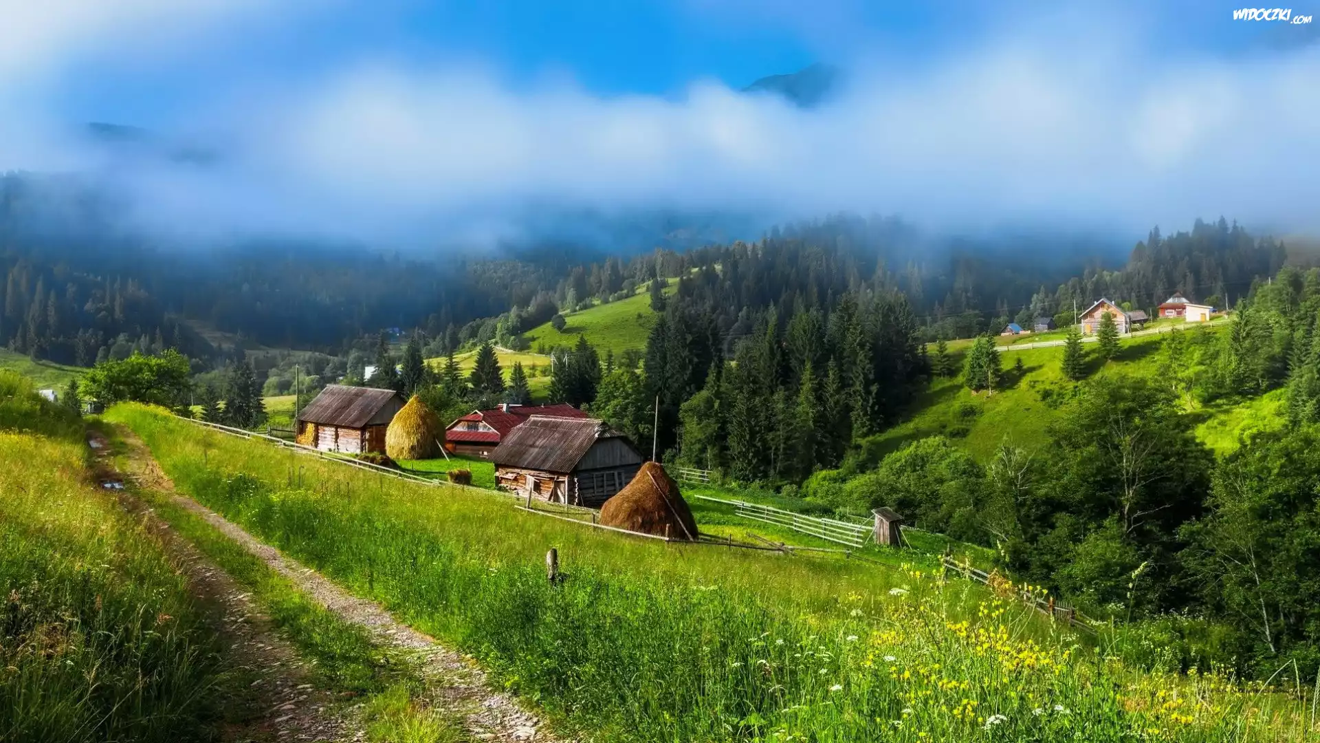 Zdjęcia, Ukraina, Wioska, Domy, Droga, Góry Karpaty, Mgła