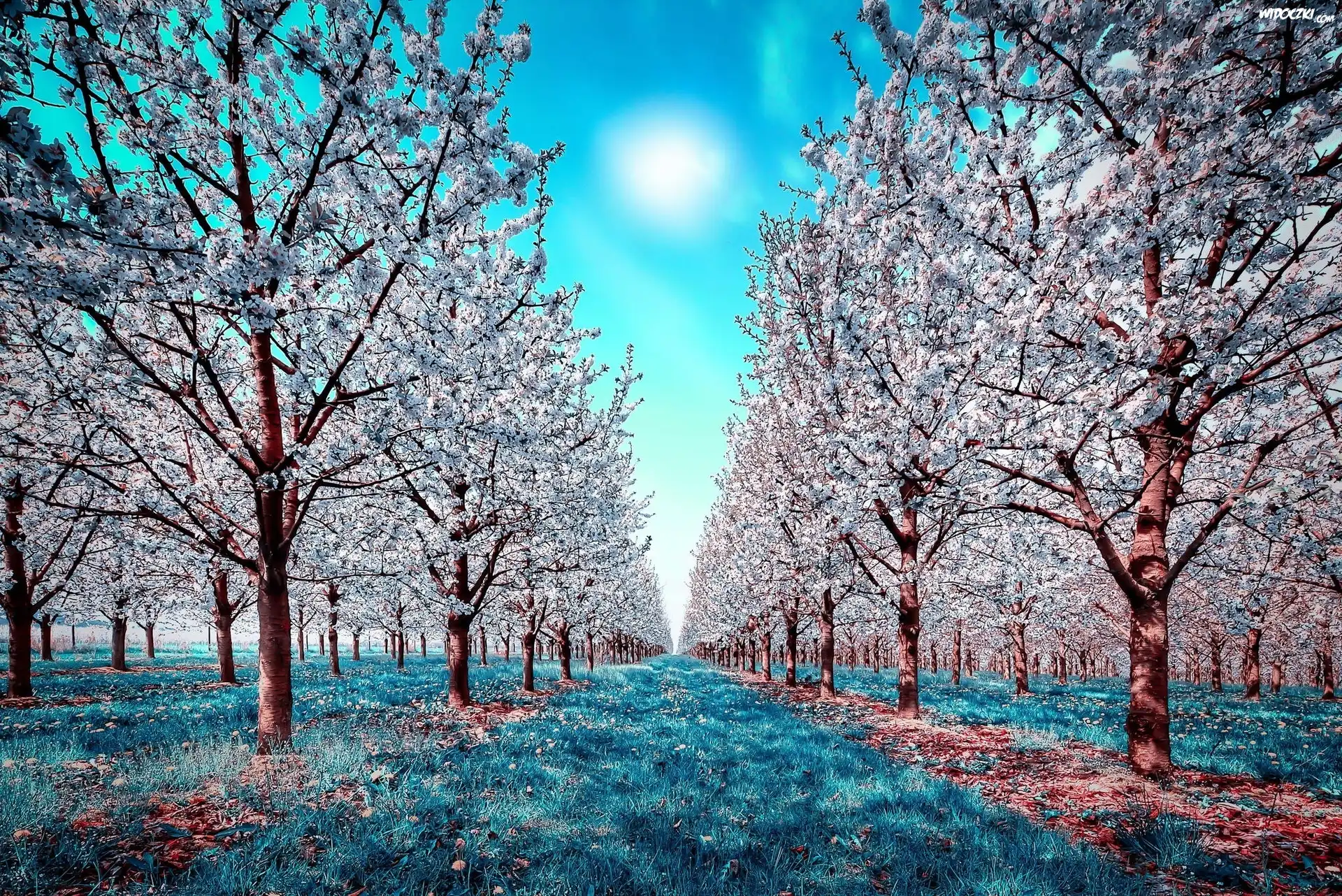 Zdjęcia, Wiosna, Sad, Kwitnące, Drzewa, Alejka, Słońce