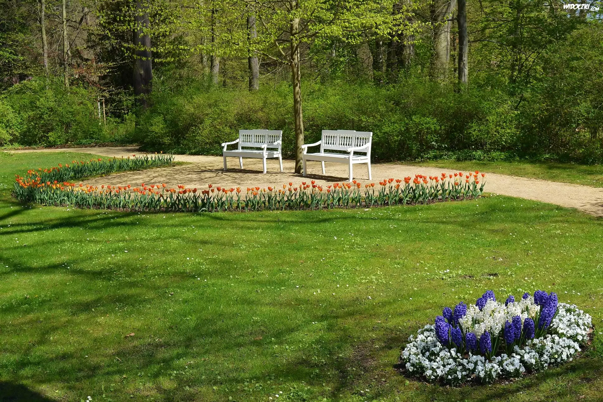 Wiosna, Park, Alejka, Ławki, Kwiaty, Tulipany, Hiacynty, Drzewa Wiosna