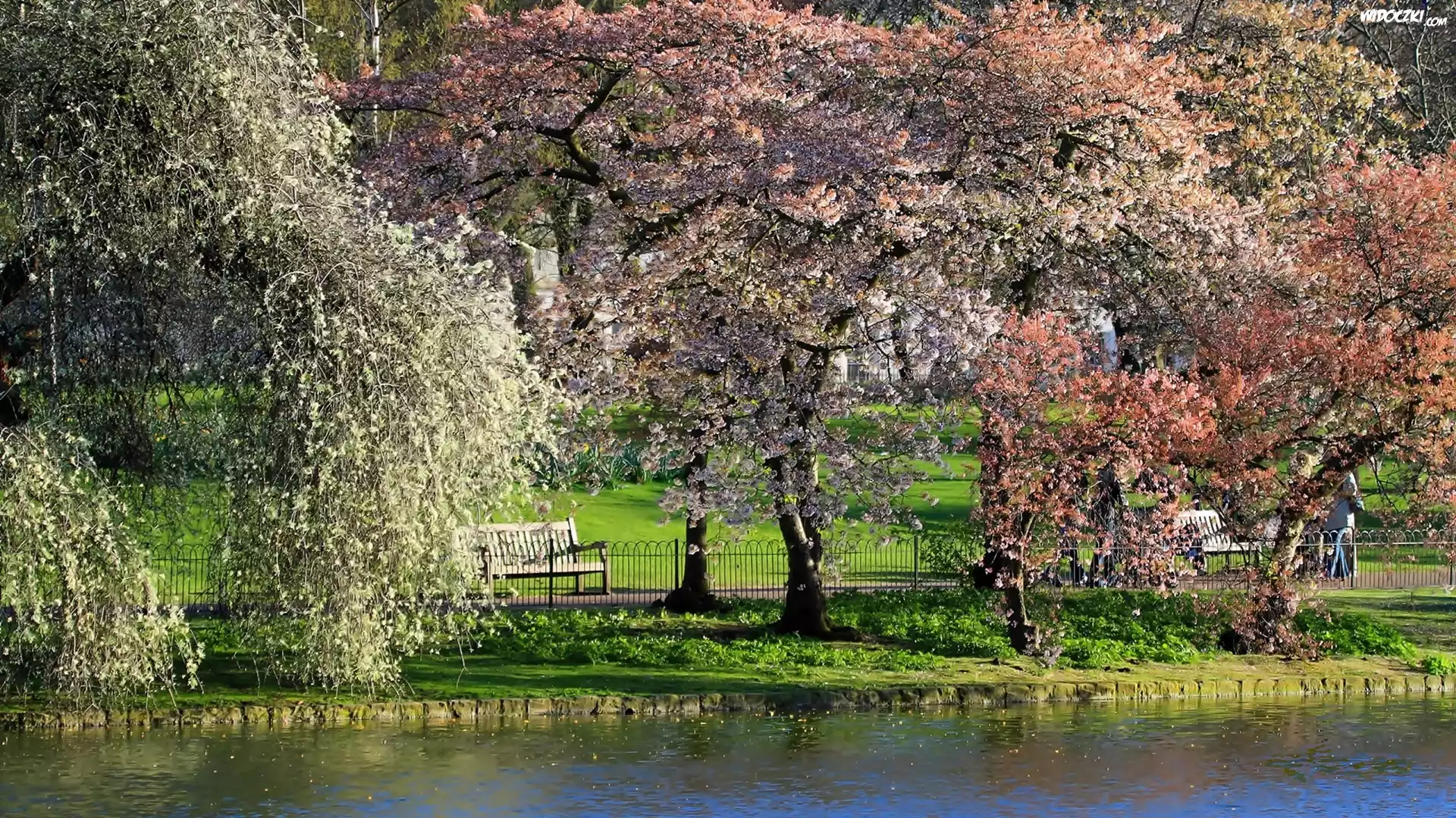 Zdjęcia, Wiosna, Park, Kwitnące, Drzewa, Staw