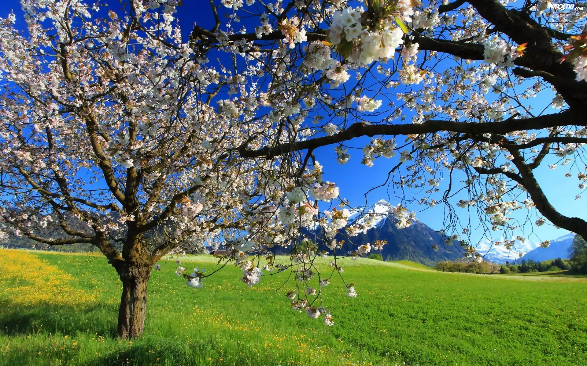Zdjęcia, Wiosna, Kwitnące, Owocowe, Drzewa, Góry, Łąka