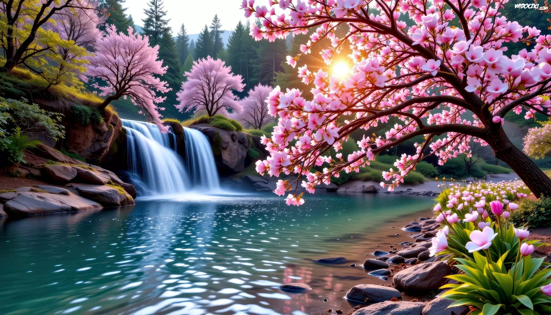 Wiosna, Wodospad, Rzeka, Las, Kwitnące, Drzewa, Zachód słońca, Grafika AI