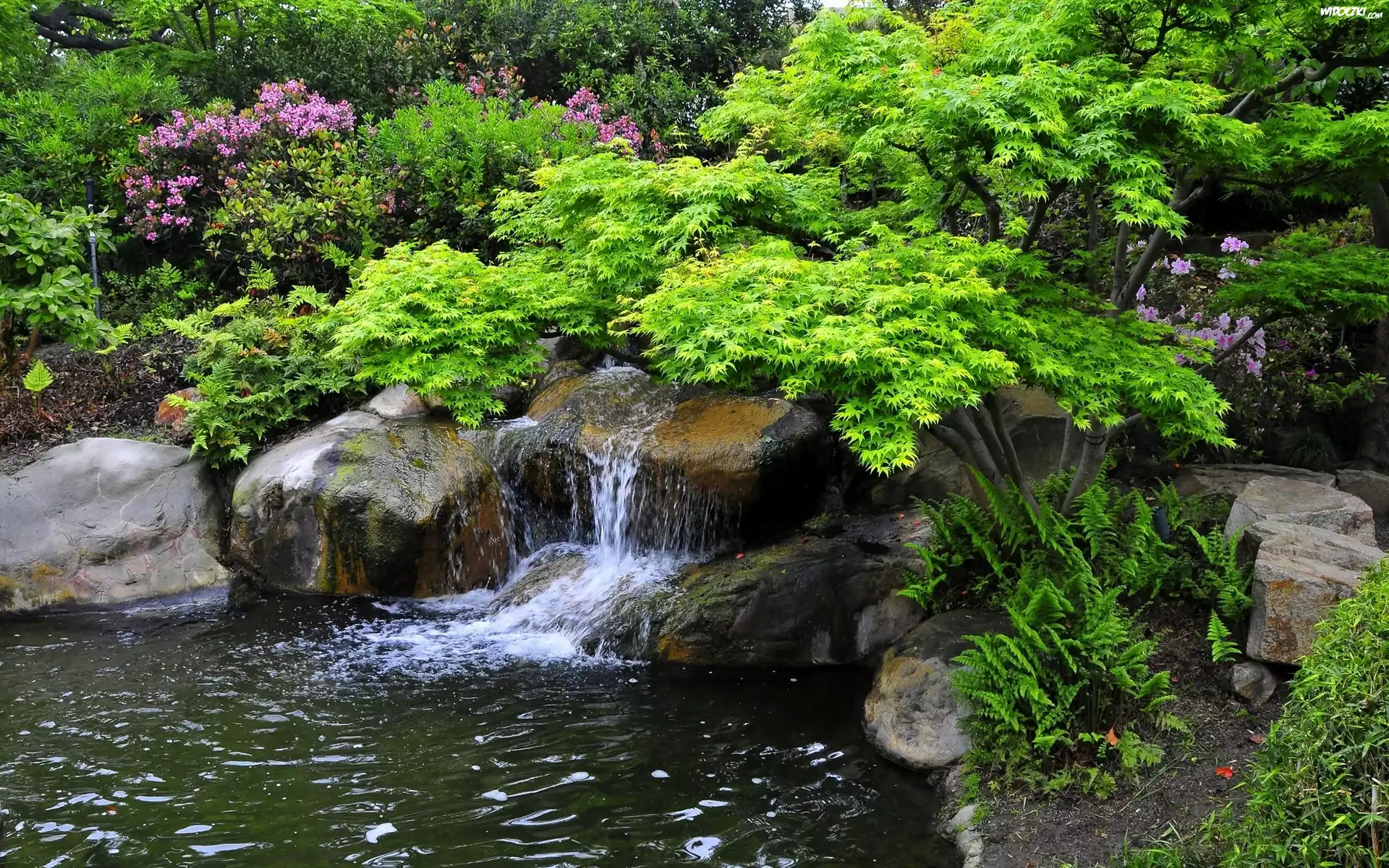 Zdjęcia, Mały, Wodospad, Kamienie, Rzeka, Kwitnące, Krzewy, Drzewa, Park, Wiosna