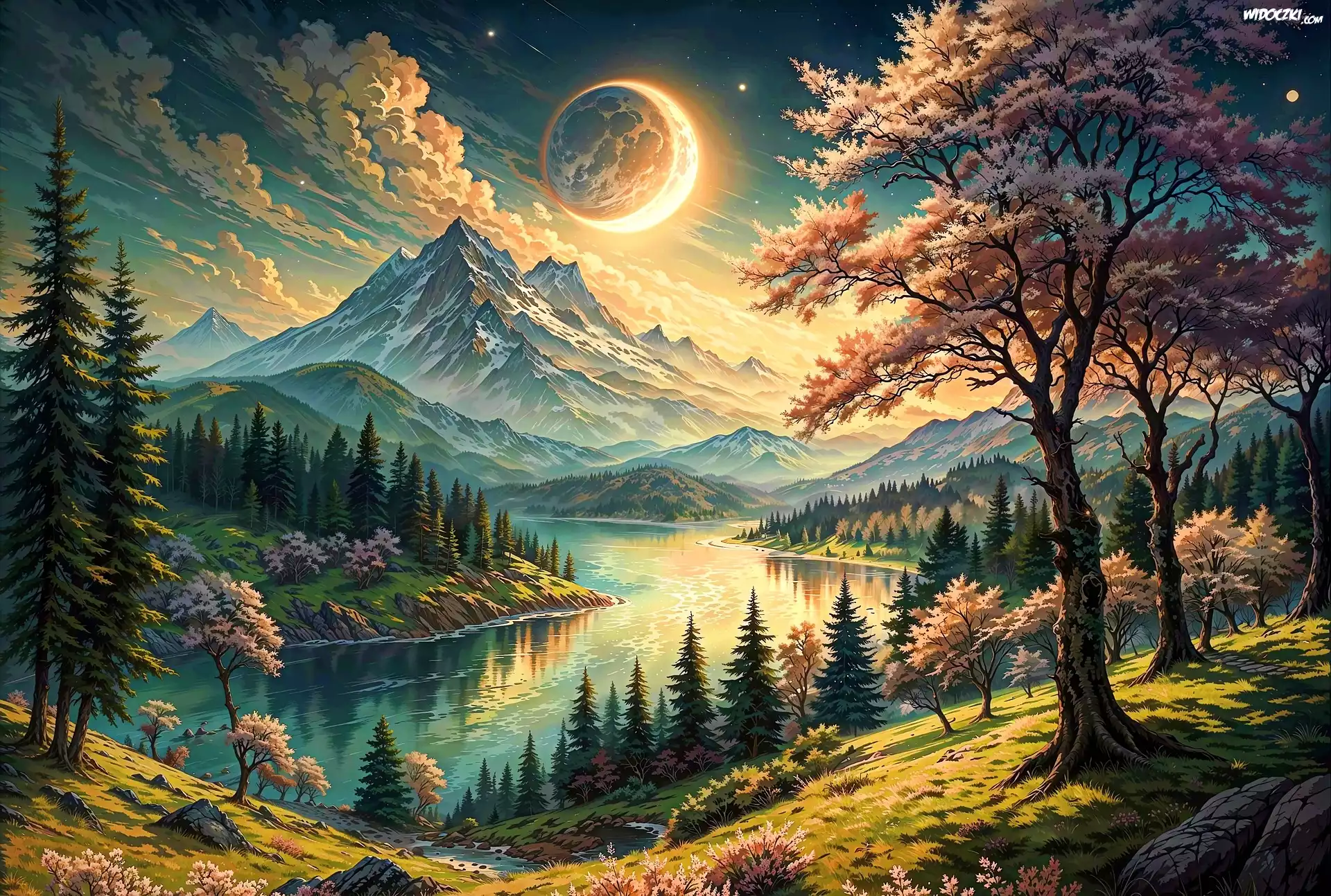 Wiosna, Kwitnące, Drzewa, Las, Góry, Rzeka, Księżyc, Grafika AI