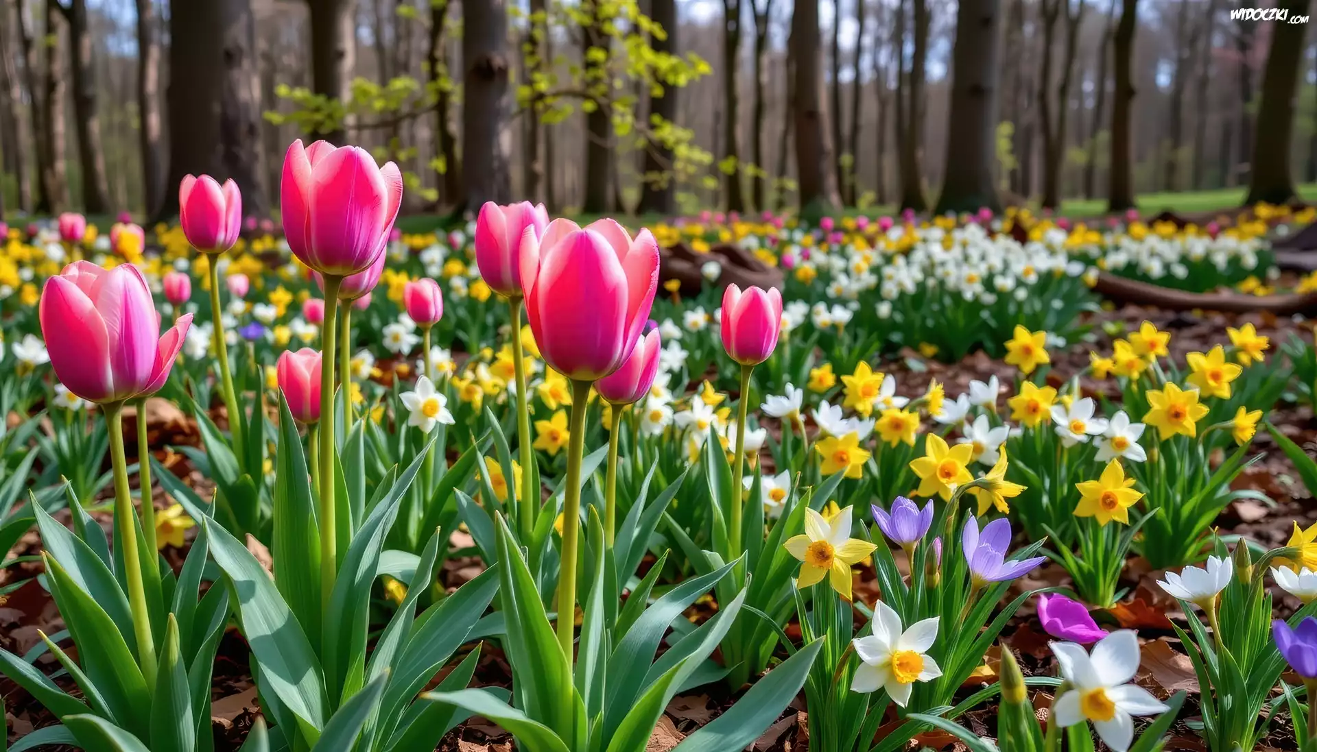 Zdjęcia, Tulipany, Żonkile, Kwiaty, Wiosna, Las, Grafika AI