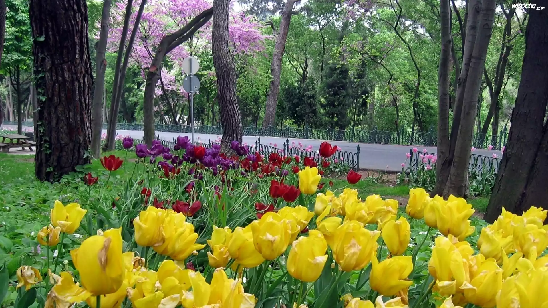 Zdjęcia, Wiosna, Park, Droga, Kwitnące, Tulipany