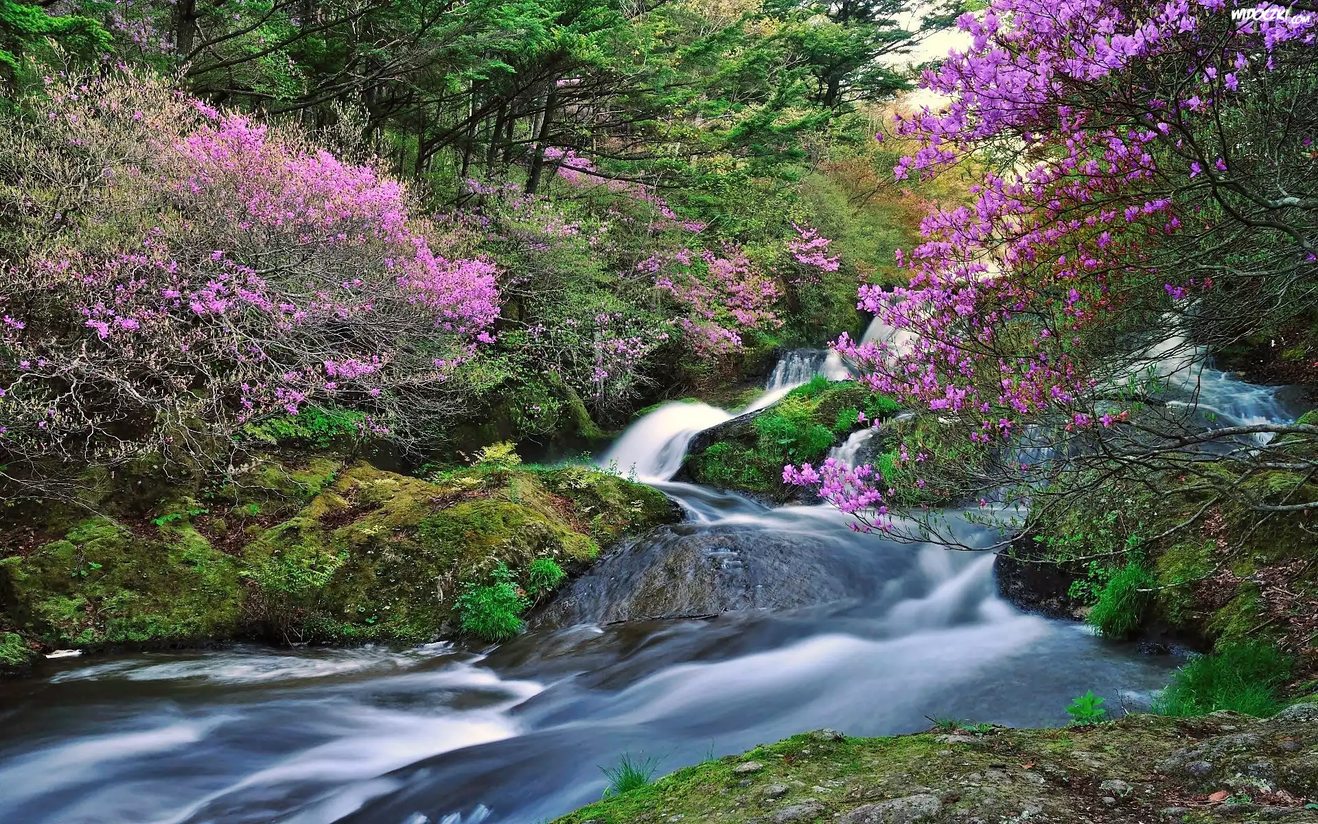 Zdjęcia, Wiosna, Las, Rzeka, Kwitnące, Różaneczniki