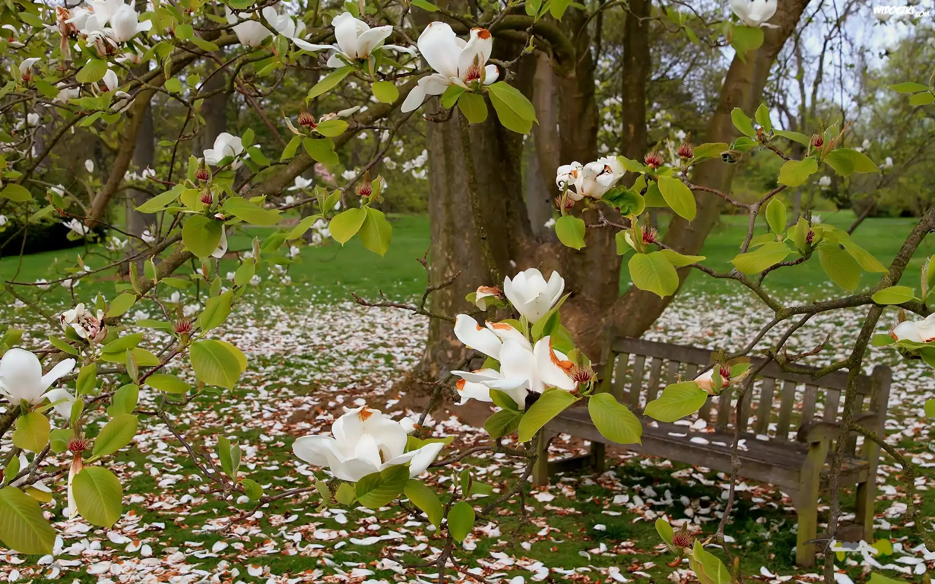 Zdjęcia, Wiosna, Park, Biała, Magnolia, Ławeczka