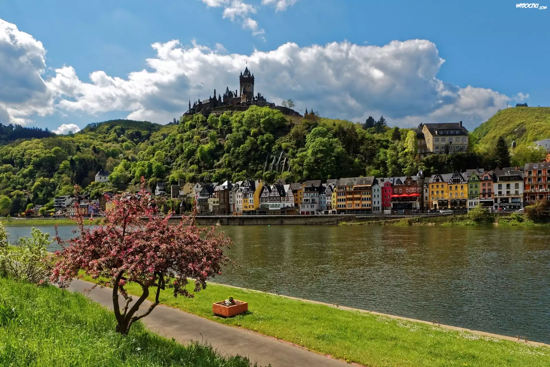 Zdjęcia, Zamek Reichsburg, Miasto Cochem, Niemcy, Rzeka Mozela, Domy, Wiosna