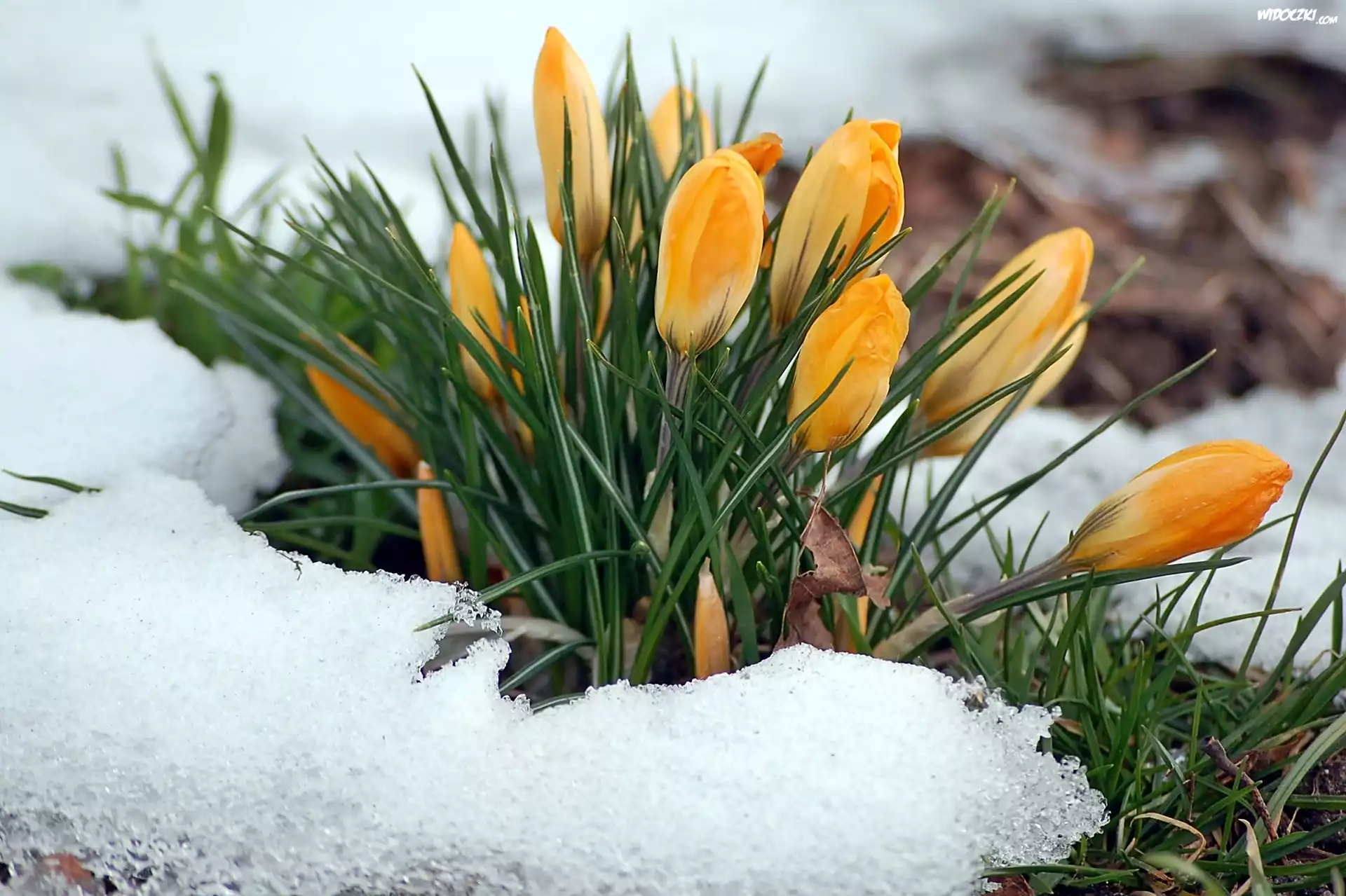 Zdjęcia, Wiosna, Kępa, Żółtych, Krokusów, Śnieg, Rozmycie
