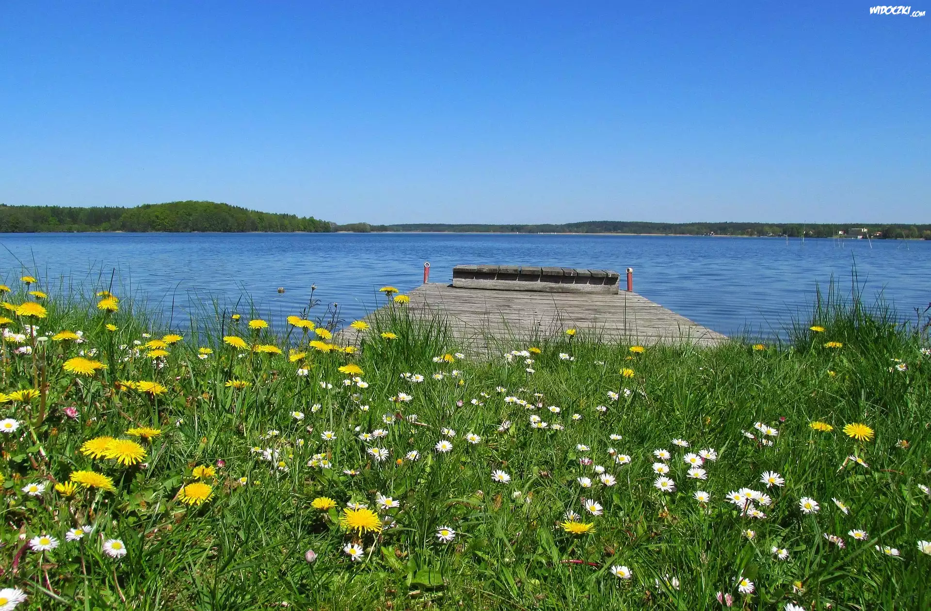 Zdjęcia, Wiosna, Jezioro, Pomost, Kwiaty