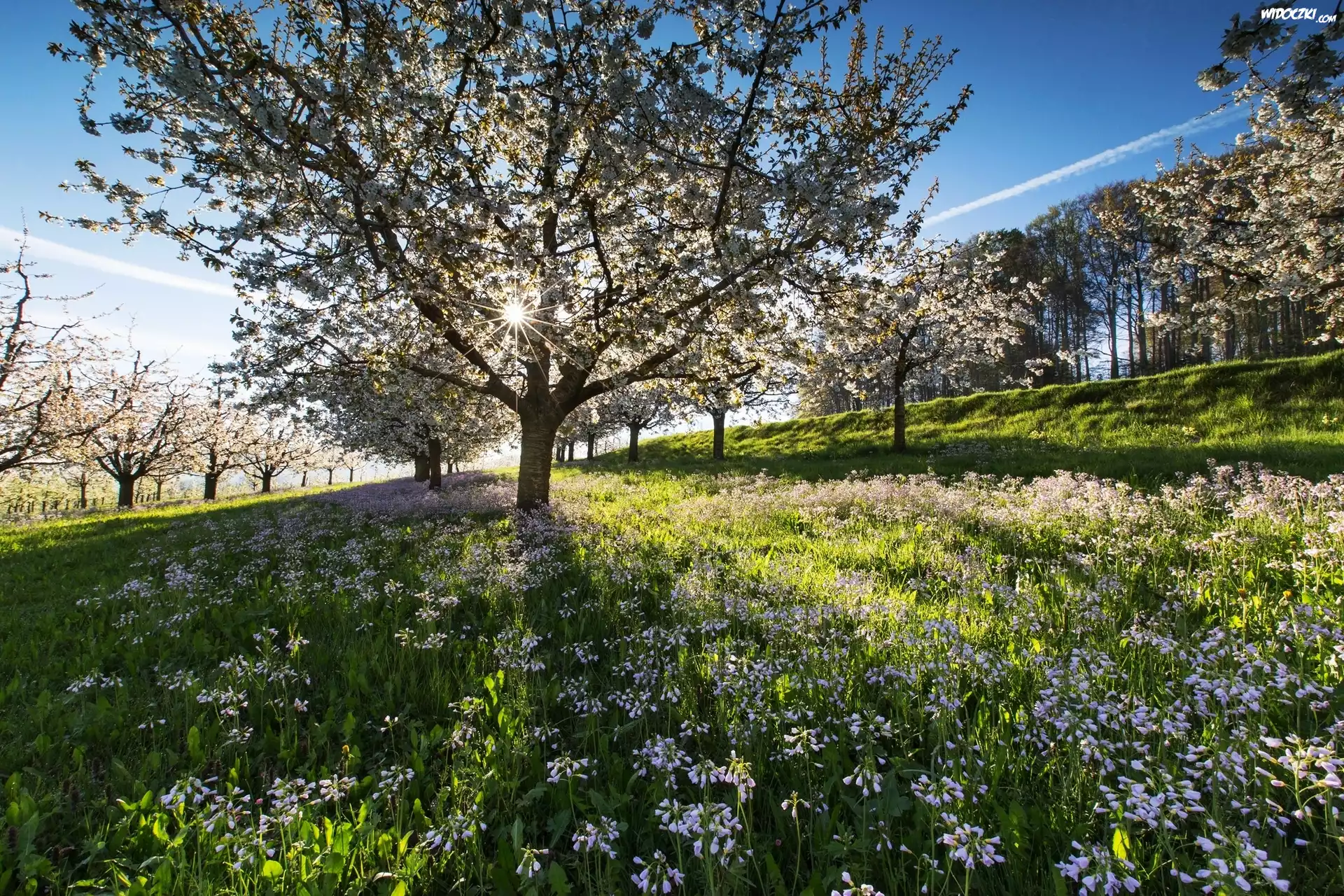 Wiosna, Sad, Kwitnące, Drzewa, Promienie słońca