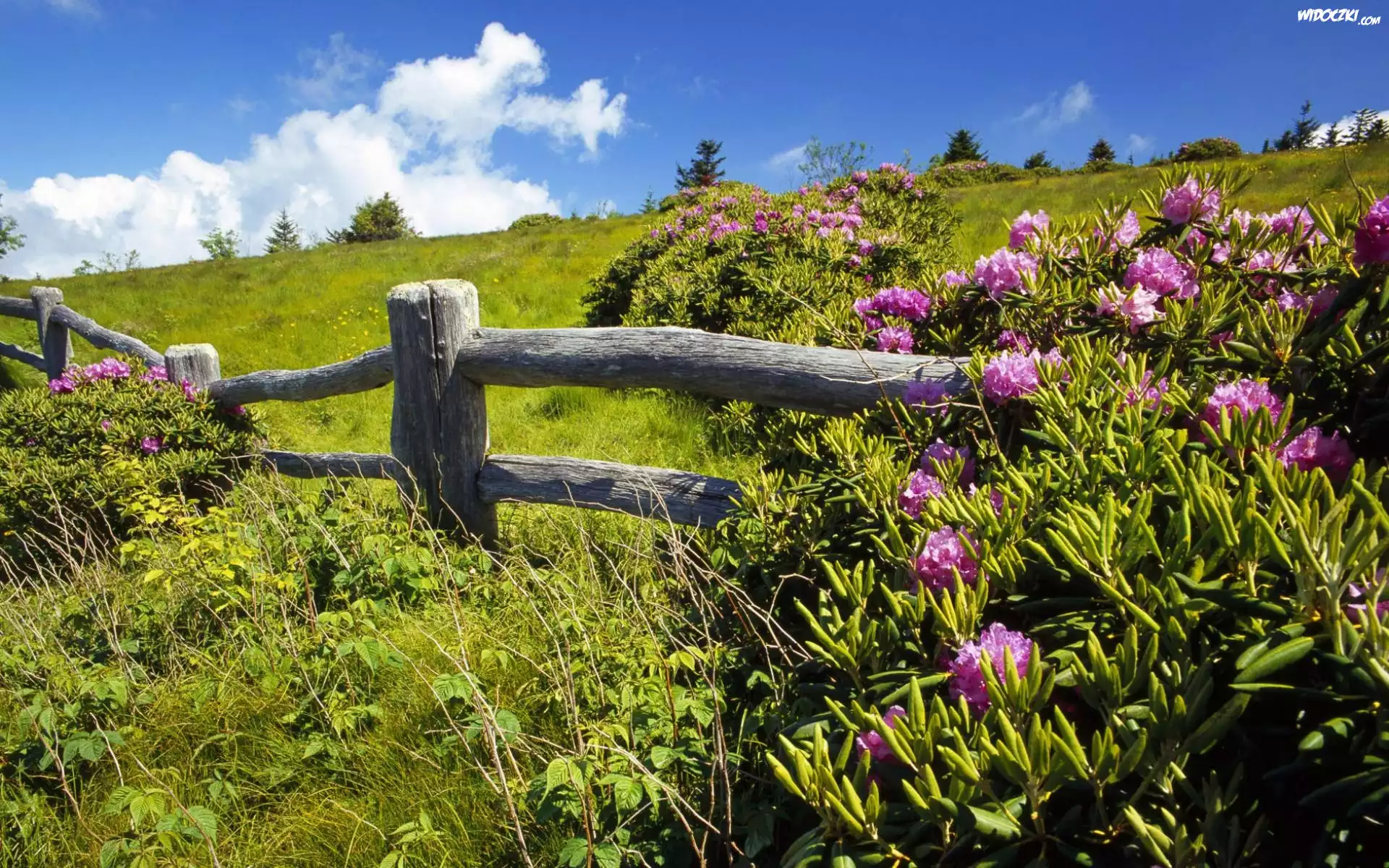 Zdjęcia, Wiosna, Łąka, Płotek, Krzewy, Różowych, Rododendronów