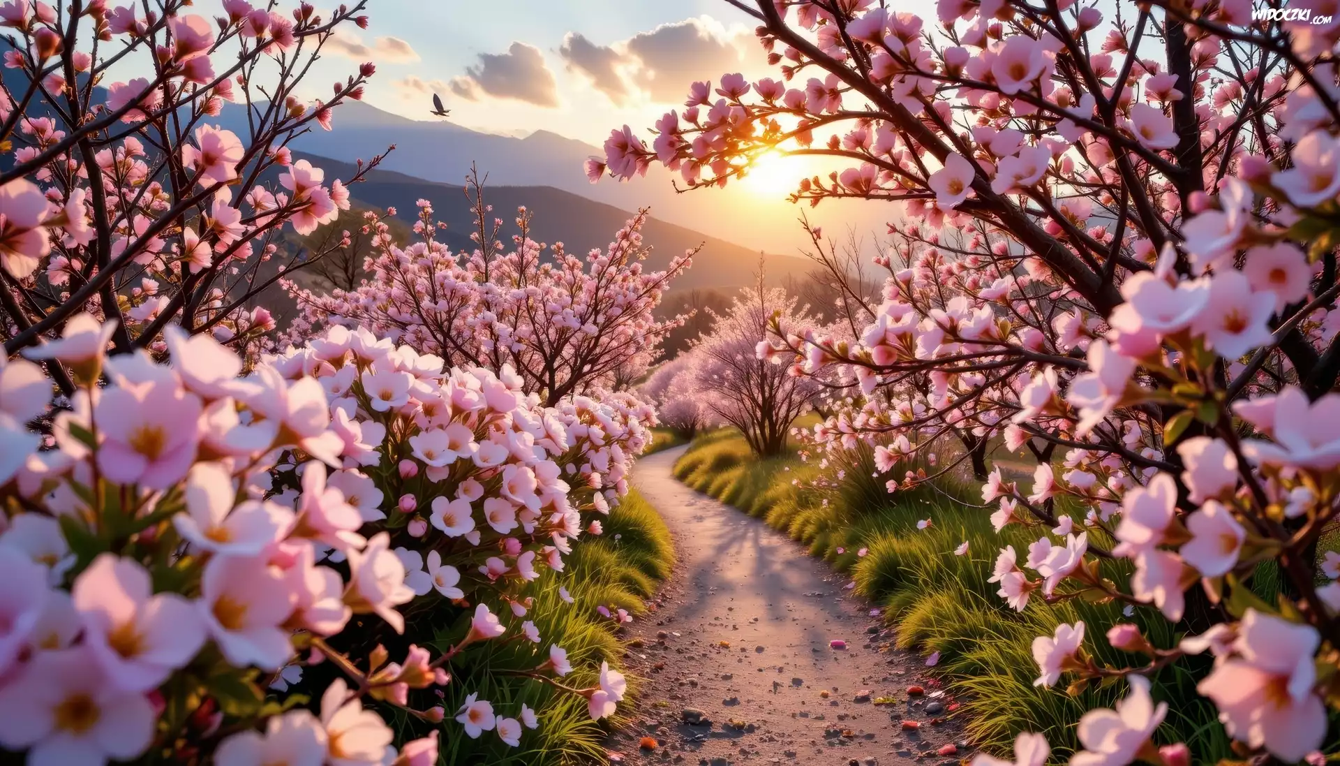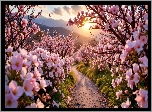 Zdjęcia, Wiosna, Kwitnące, Drzewa, Gałązki, Różowe, Kwiaty, Ścieżka, Zachód słońca